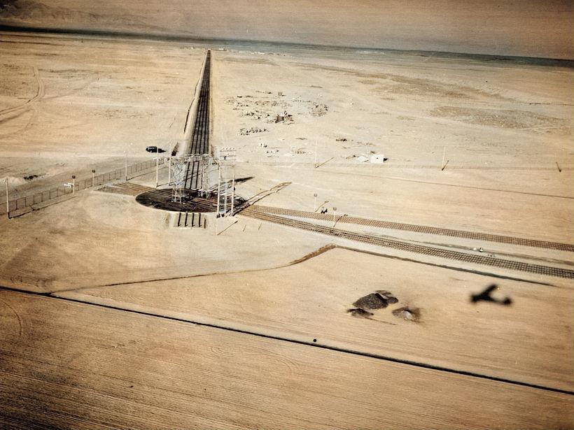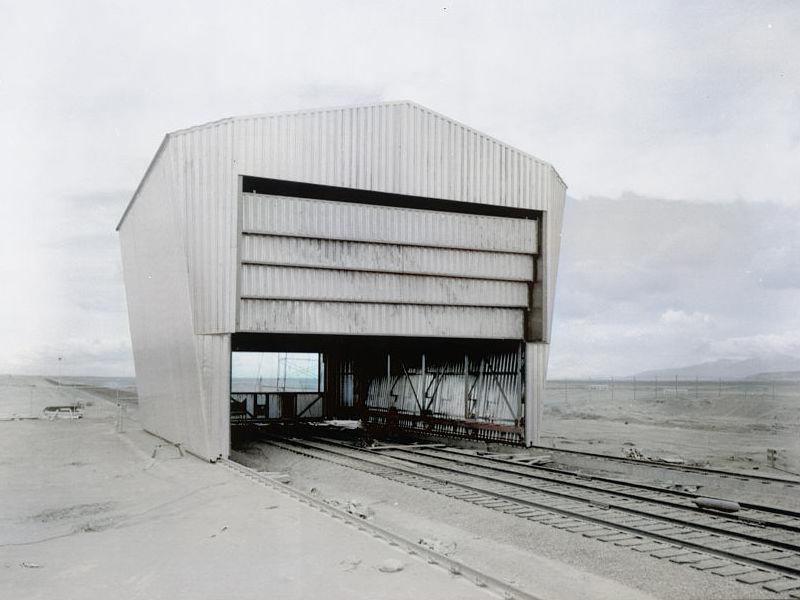 Various buildings from the maintenance facility to the site’s hangar and test locations were reportedly connected by six rail spurs, the longest of them 1.5 miles in length. All linked back to a specially built turntable, measuring 84 feet across, with short rail extensions jutting off in three directions that Waite said allowed the locomotive to switch between pushing and pulling positions. For reasons seemingly lost to time, pushing seems to have been the modus operandi, presumably so operators could back away in the event of an accident with the payload. Radio contact with and video surveillance on the train were maintained at all times, and the engine even had a redundant set of controls should the main set malfunction.