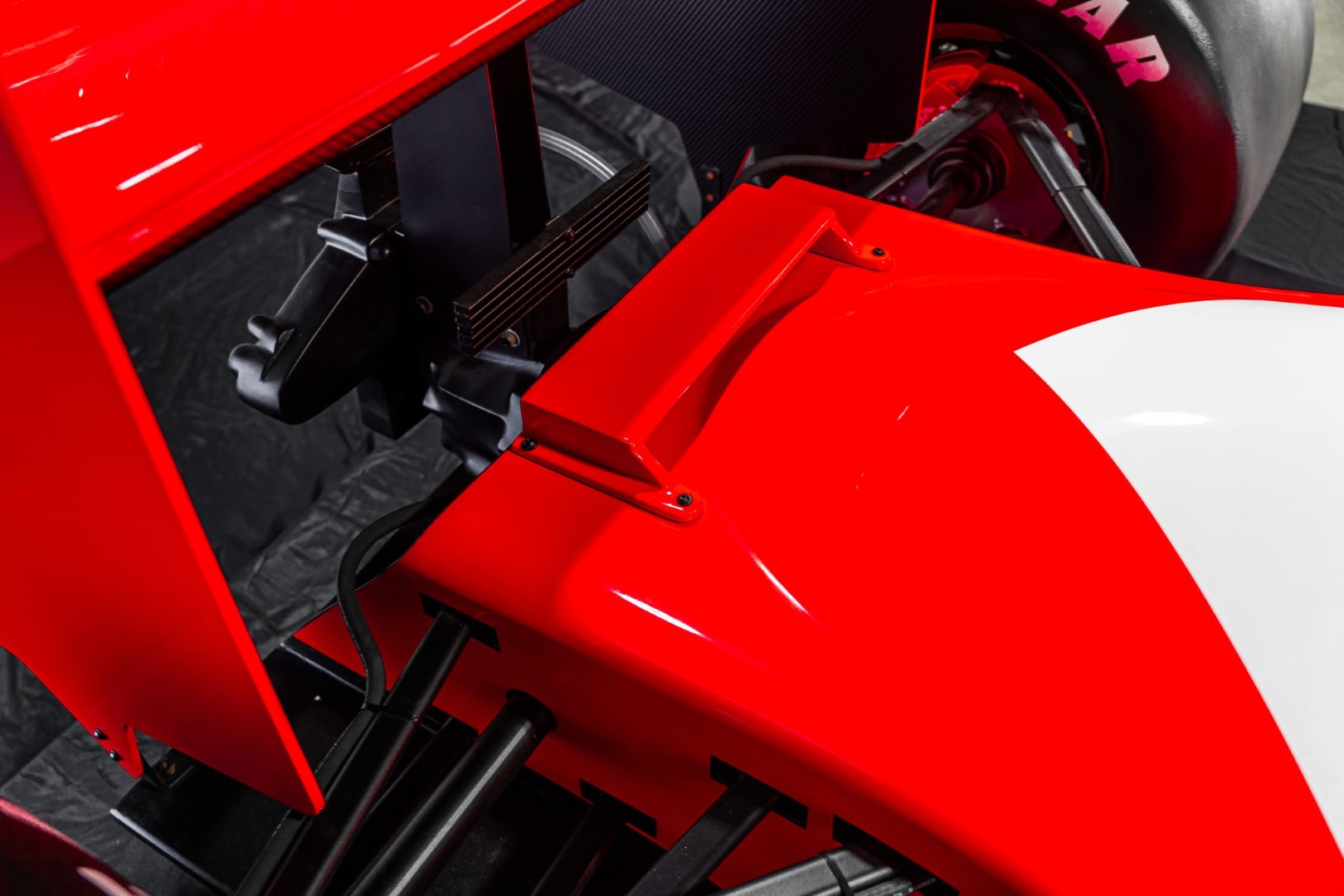 We can tell you one thing: Don’t be fooled into assuming that anything here is what it seems. The suspension, brakes, wheels, and tires all look accurate enough (the wheels are even held in place with actual center-locking nuts) but all of that is made from fiberglass (tires included). The detailing on the gearbox suggests a more diverse mix of materials, but the level of craftsmanship on display here is so impressive as to be deceiving. Whatever it’s made of, it certainly looks sturdy enough to sit in, and the interior comes with a seat, replica wheel, and a racing harness.