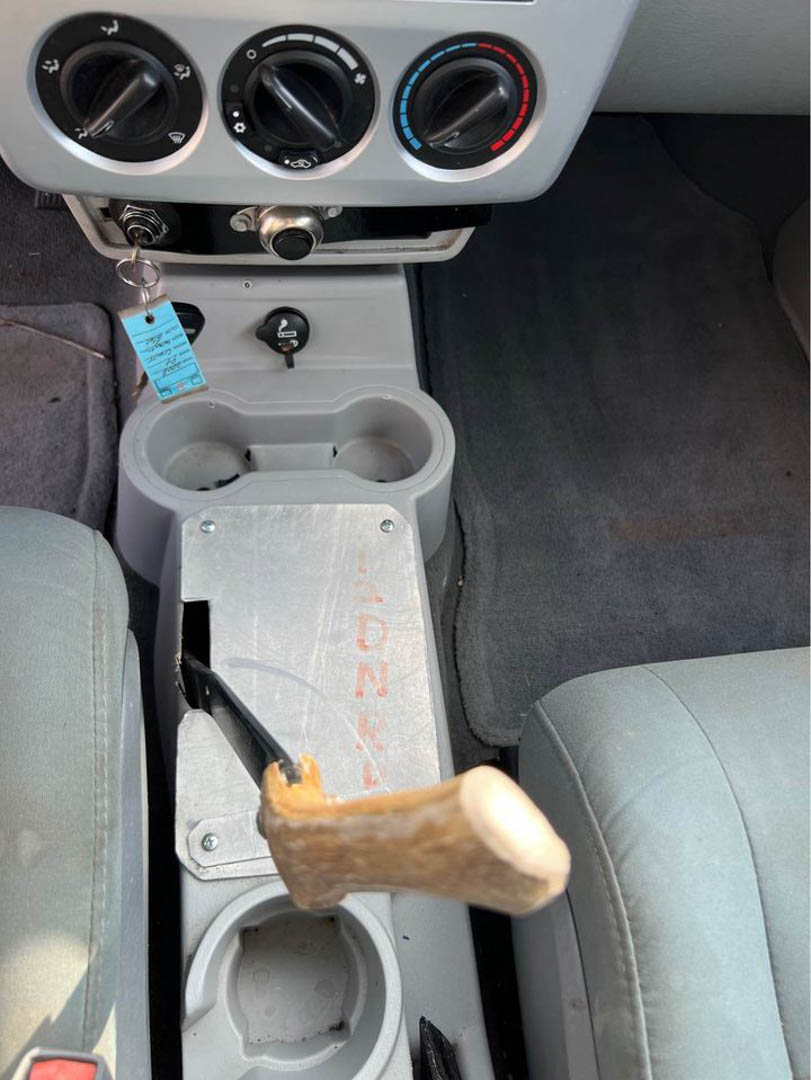 Inside, it looks like a normal PT Cruiser, with the typical body color-matched dashboard trim, cloth seats, and four-spoke steering wheel. The only noticeable difference between this car and a stock PT Cruiser is the extra long automatic gear lever, which sports a handle seemingly made from a deer antler. Interestingly, the shift gate patter is reversed, so from top to bottom it goes “1, 2, D, N, R, P,” which is written in market on the custom metal trim plate.