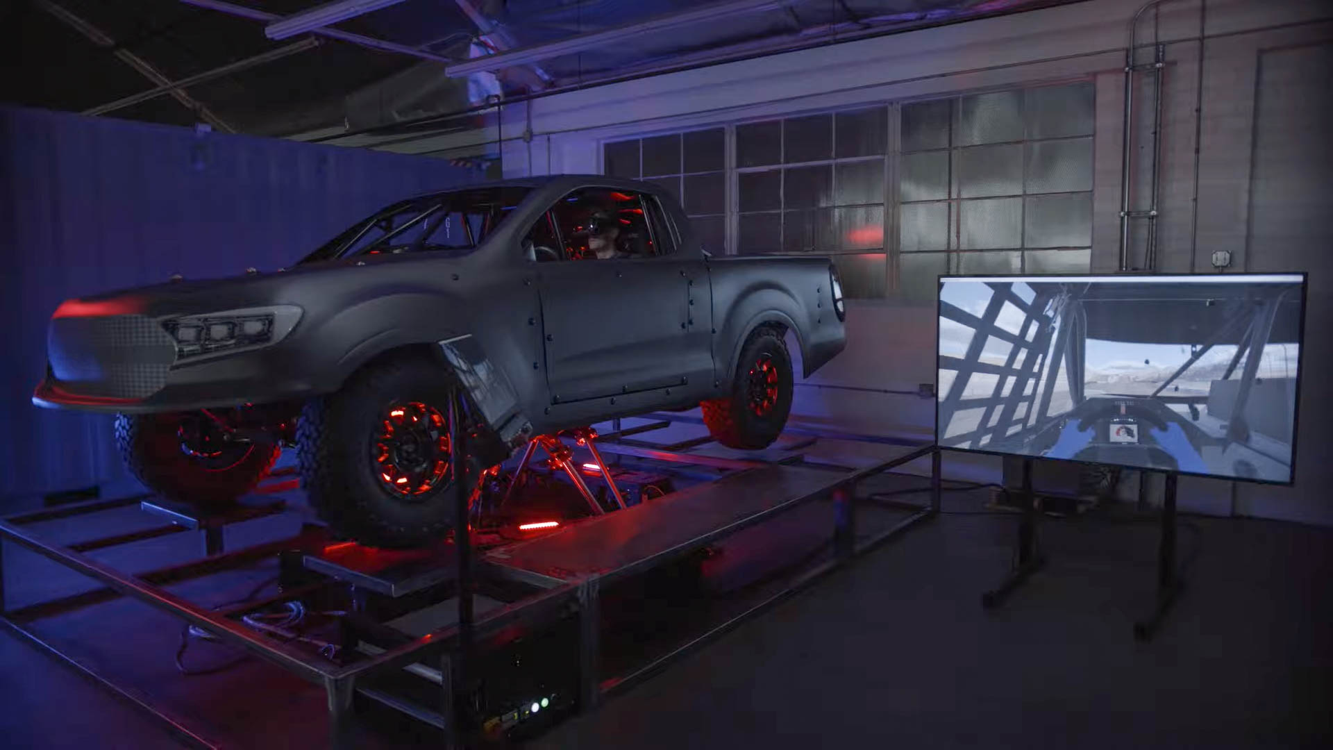 The rig is made from an actual trophy truck racer, just with its powertrain and drivetrain removed. Both the tubular steel frame and body of the truck remain, though CXC had to modify them to fit a door, as trophy truck drivers usually get in Dukes of Hazard style, through the window. The sim driver sits in a racing seat, using the same pedals as the actual trophy truck, and wears VR goggles that simulate racing on an off-road circuit. And because a real trophy truck lacks a windshield, there’s a big fan inside the rig that blows air onto the driver’s face, to simulate that open air experience.