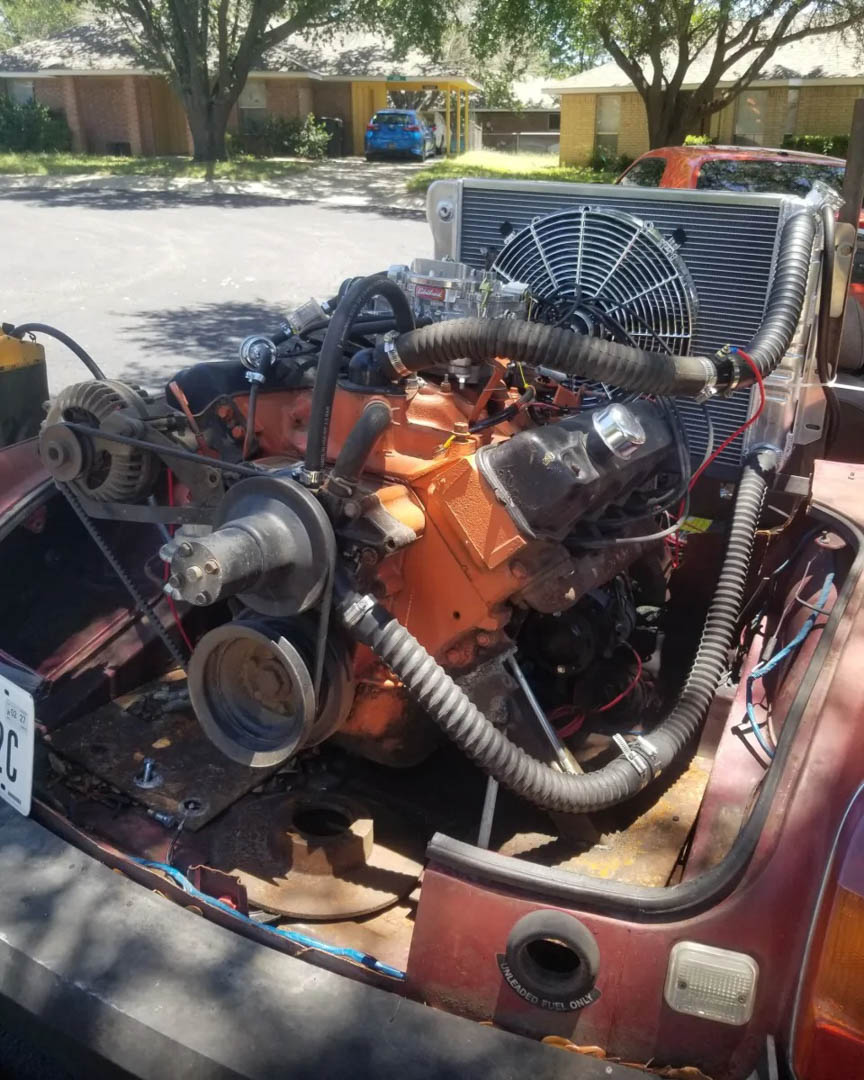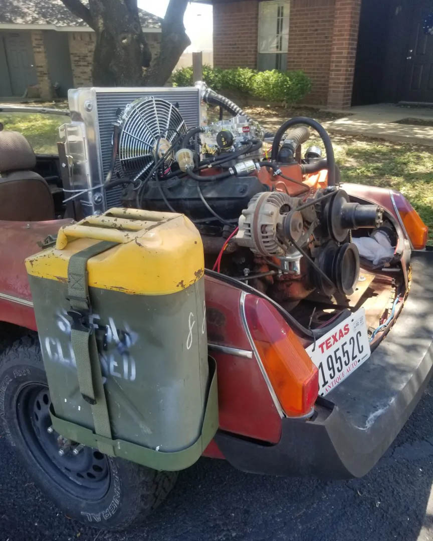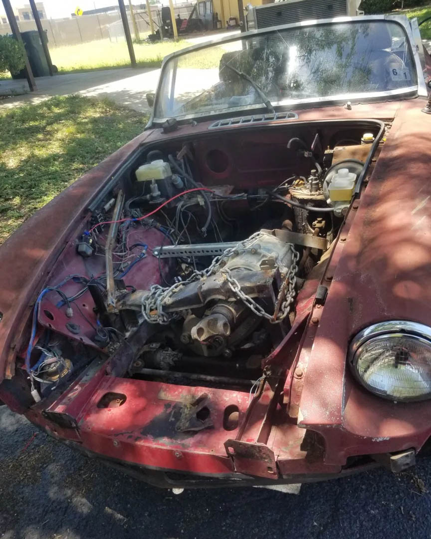 The 1979 MGB originally used a 1.8-liter naturally aspirated four-cylinder engine and a four-speed manual transmission, to drive the rear wheels. It also weighed less than 2,500 pounds, making it a featherweight by today’s standards. However, West was having none of that. Instead he decided to rip out its tiny four-pot (which probably didn’t run anyway) and stick in a 318-cubic-inch Chrysler V8 from a ’66 Dodge Charger. Except that monster engine wouldn’t fit in the MGB’s tiny engine bay. So he stuck it in the trunk.