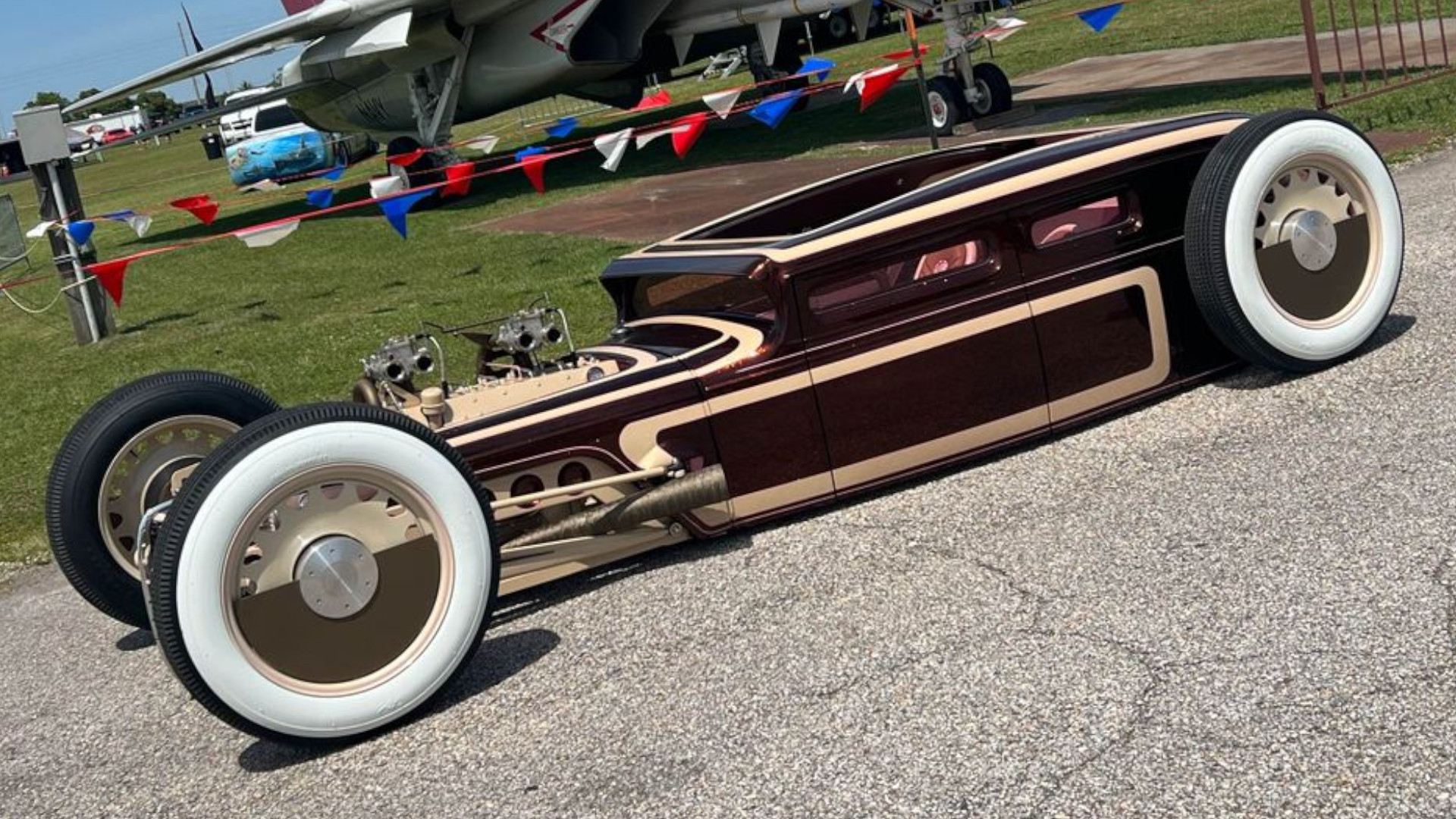 The awe-inspiring details don’t stop at the engine. The car boasts a custom interior, kitted out in true hot rod style, while the custom paint job adds to the allure. The steering yoke is a unique touch, with the overall interior looking like something from a neo-futuristic spacecraft straight out of an anime.