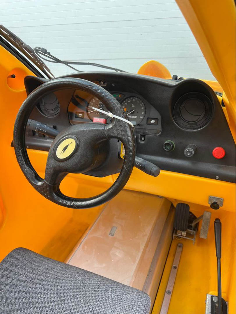 The SAM is a neat little car, though. The three-wheel, tandem-seat design isn’t groundbreaking but it’s quirky and fun, as it gives the car an incredibly narrow footprint while still seating two people. It uses an extruded aluminum chassis and an air-filled, double-walled thermoplastic body made from recycled polymer, according to documents provided by the seller. And despite being 23 years old, it still looks modern, with its futuristic design and double-hinged gullwing doors. When open, the SAM’s two doors remind me of the Tesla Model X’s falcon doors, except the SAM’s are manual and won’t fail as often. The top part half of the door is glass but the bottom half, which is separated by a hinge, matches the body.