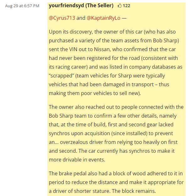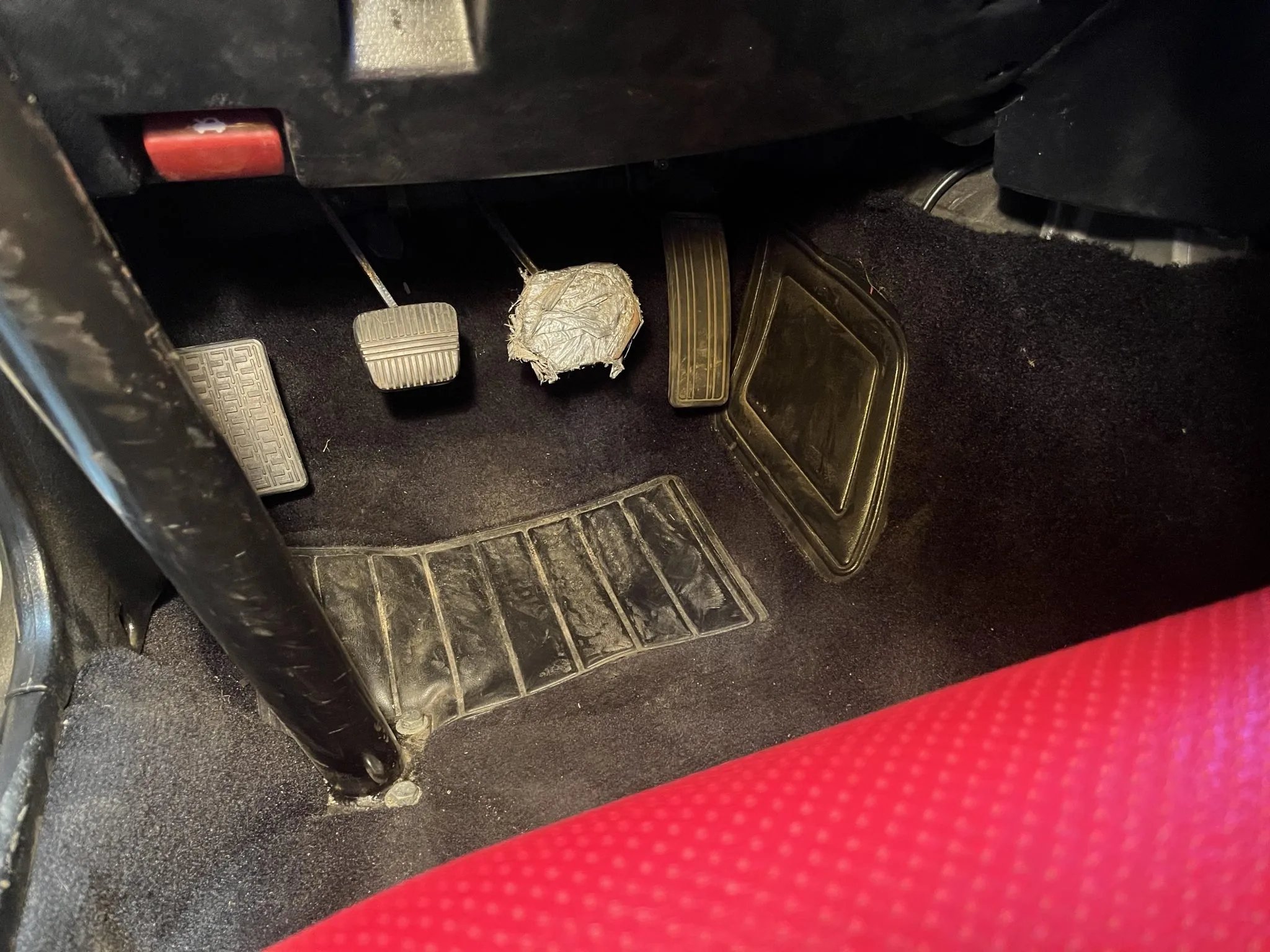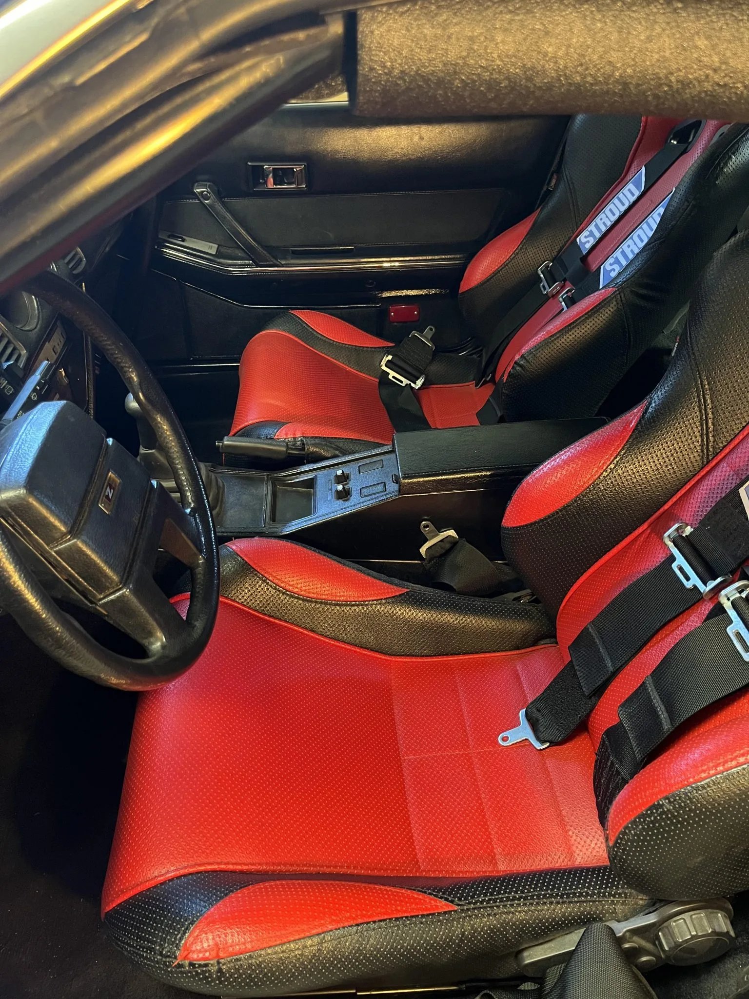 Luckily for us, the story didn’t end there, as the current owner commissioned a full bare-metal restoration with a perfect replica of Cruise’s original race livery. In the ensuing years since its restoration, it’s been driven very lightly, as the listing only notes 5,000 miles on the odometer and the photos (taken by Weird Car Twitter’s excellent resident photographer Deerfella) show a mint-condition time capsule of a Z. The car still has a six-point cage and classically rad red-on-black vinyl seats, although the most noticeable and objectively funniest upgrade to the interior is the wooden block taped to the brake pedal. According to the seller, this modification was made so the 5-foot-7 Cruise could reach it more easily.