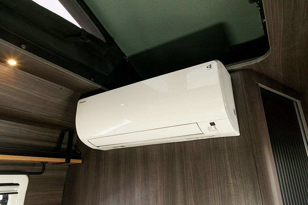 Inside, the BR75 is well-provisioned for a comfortable camping experience. There’s a pop-up roof section that allows adults to stand comfortably inside. The dining area converts into an adult-sized double bed, while the above-cab section serves as an additional smaller sleeping area. Multiple windows provide a light and airy feel. The camper is trimmed with attractive wood and tile finishes, and even features a full-sized Daikin home air conditioning unit. Several power outlets are also available inside and out for running your gear.