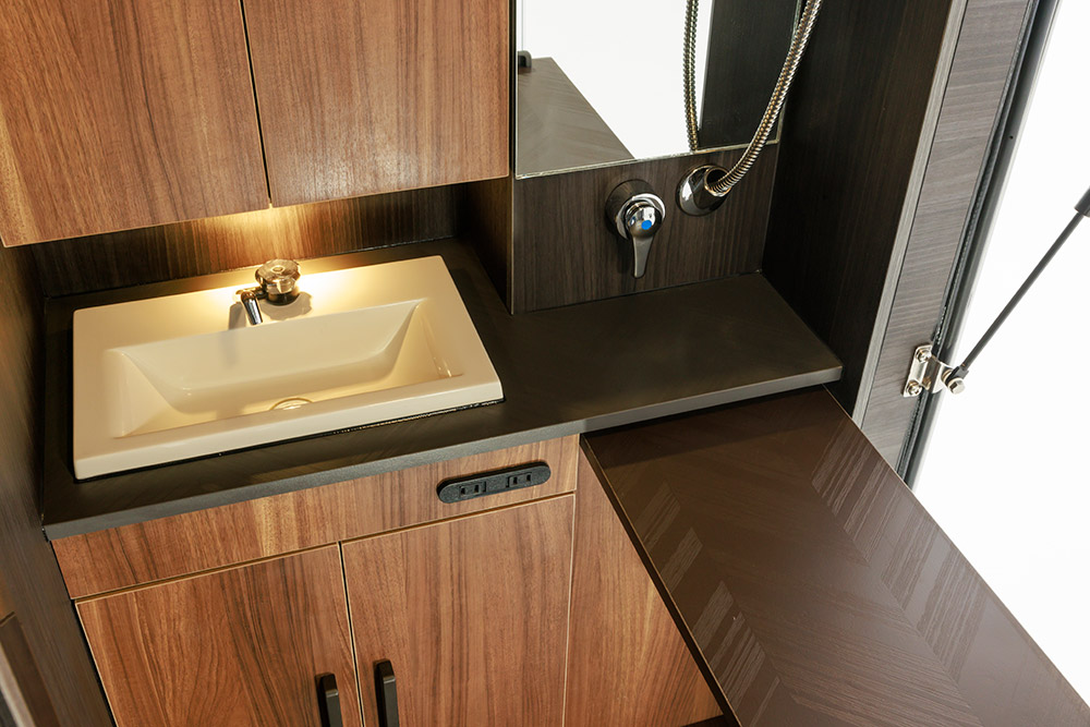 When it comes time to wash up, the waterproof bathroom area comes in handy. There’s a shower head, along with a floor drain, plus a mirror, sink, and counter for your toiletries. Sadly, a toilet isn’t available, so you’ll have to hunt down facilities or make like a bear in the woods.