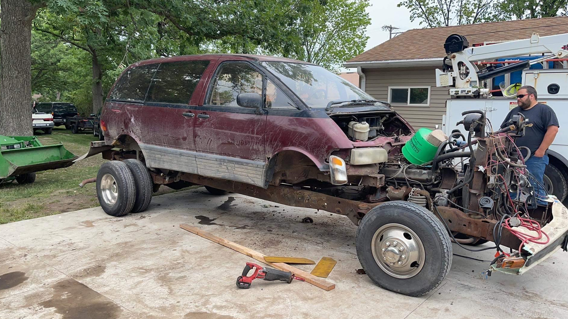 Now came time to mount the Previa body to the RV chassis. Nearly everything underneath was cut off and an optimal location was chosen to place the body. Both told me that “very little” modifications were actually needed to get steering, throttle, and brake controls working between the chassis and its new body.