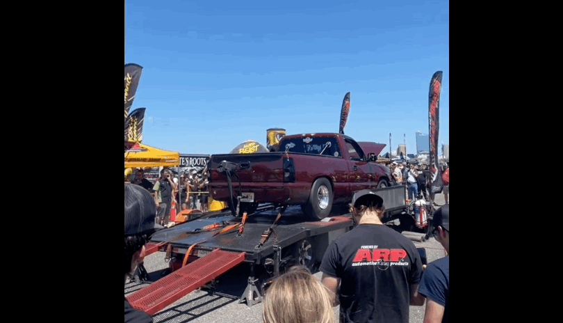 You can tell straight away that the event setup is suboptimal. People are gathered around the dyno trailer, and the guy closest to the truck isn’t even paying attention as it starts its run. He looks up as the driveshaft exits stage left, hitting the people stationed behind some cones and caution tape. As you’d expect, that wasn’t enough to stop the metal tube spinning so fast that the nuts and bolts let loose.