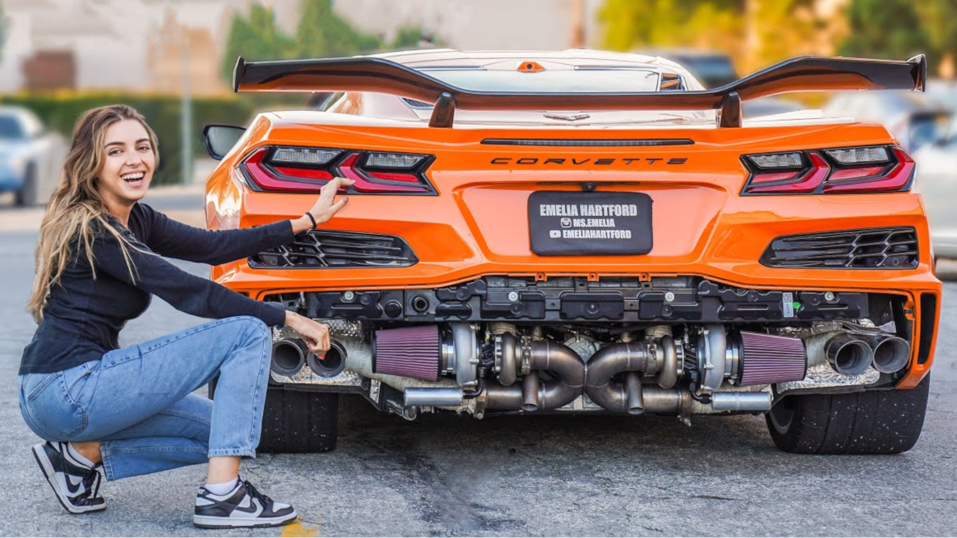 Out of the box, the Corvette Z06 is already a hot performer with a great sound. Its 5.5-liter V8 engine delivers a mighty 670 horsepower, and sings beautifully by virtue of its flat plane crank. For YouTuber Emelia Hartford, though, the opportunity to wring more power out of the car with forced induction was too tempting to ignore. In a video posted to YouTube, she’s billing her build as the world’s first twin-turbo Z06.