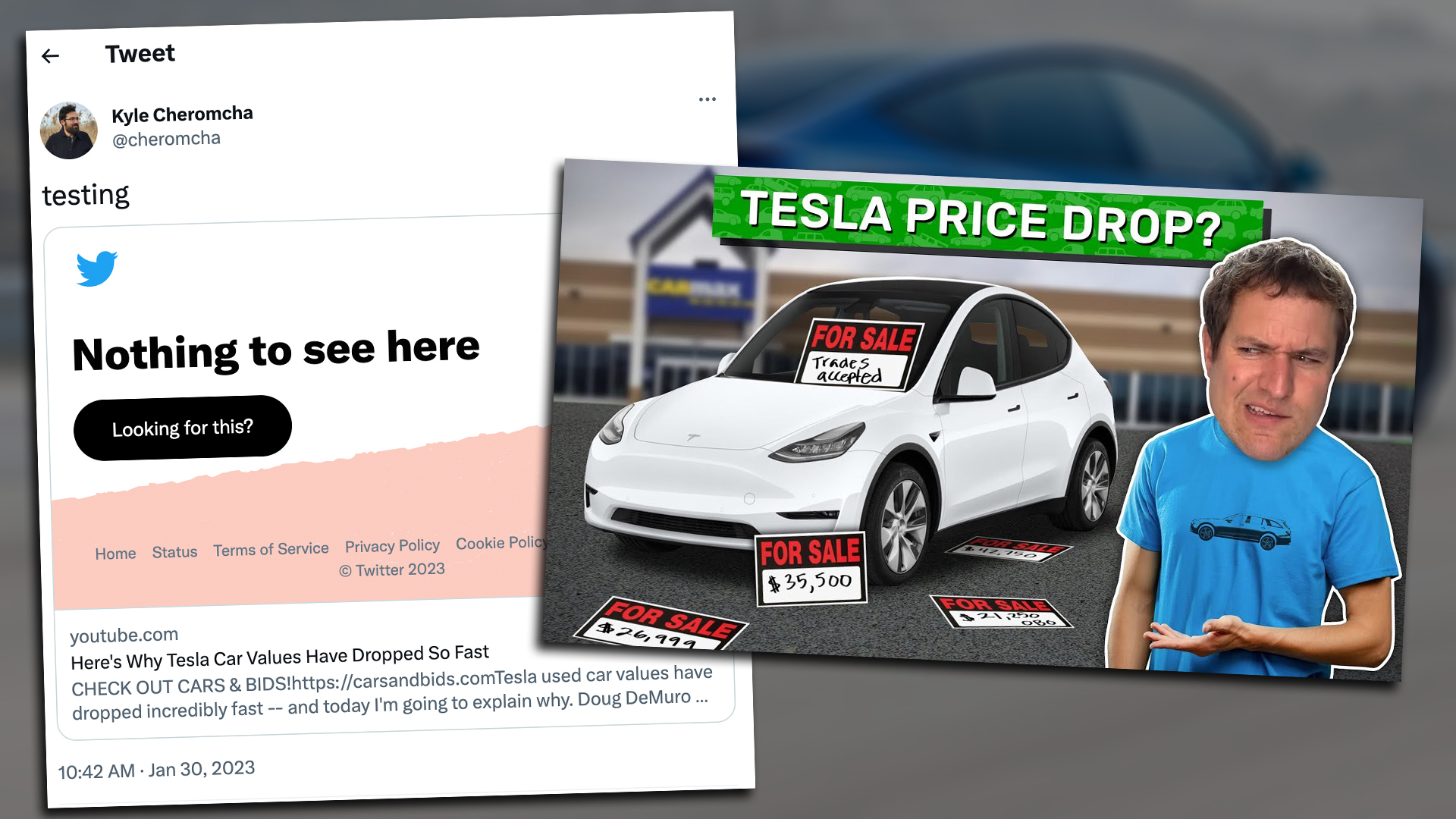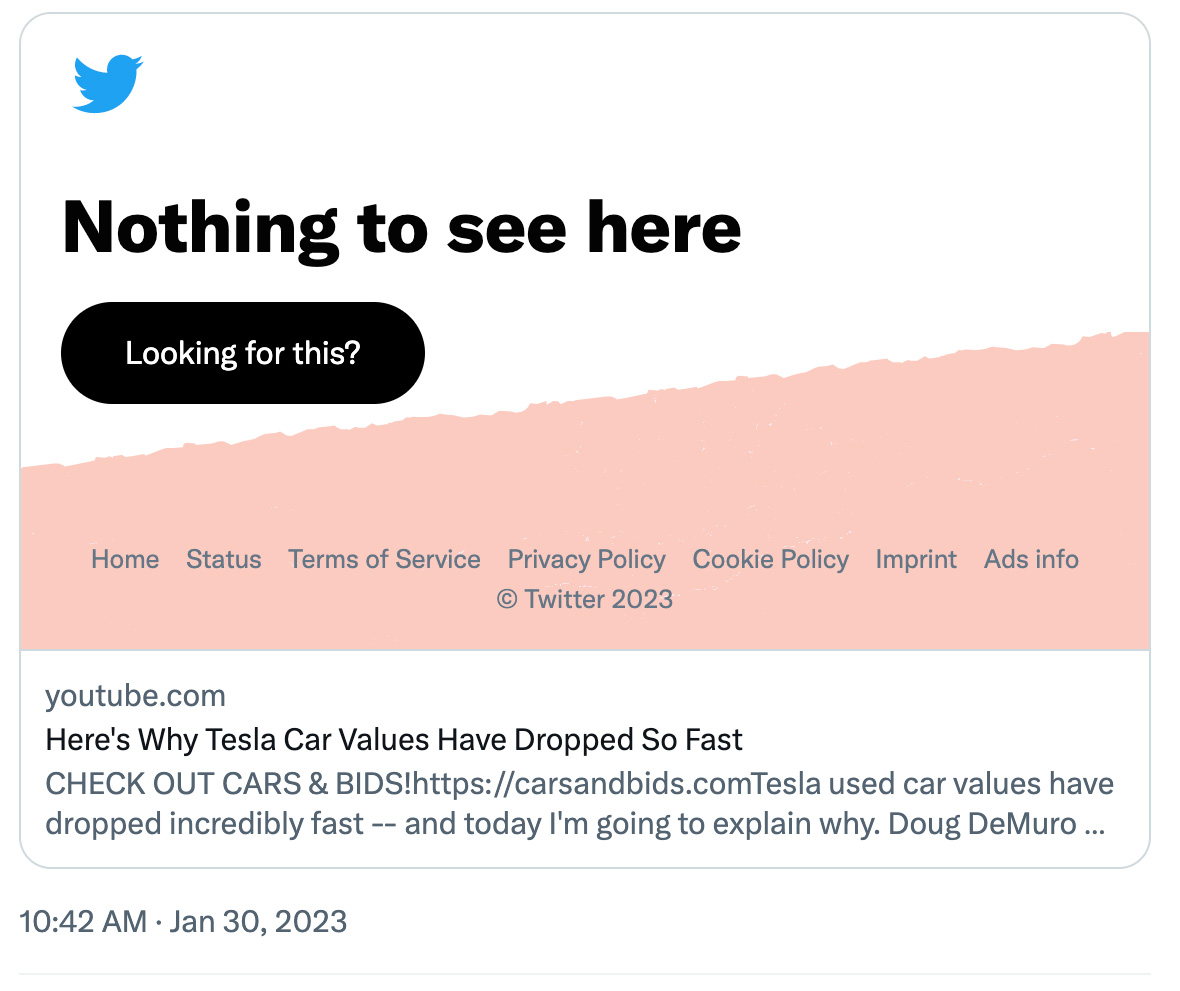 Tesla and Twitter CEO Elon Musk apparently doesn’t want the two mixing more, striking yet another post from the social media platform about the electric carmaker. Multiple Twitter users reported that Doug DeMuro’s popular video about Tesla’s used car prices falling couldn’t be reposted Monday with a picture saying “Nothing to see here,” when the YouTube link is added.