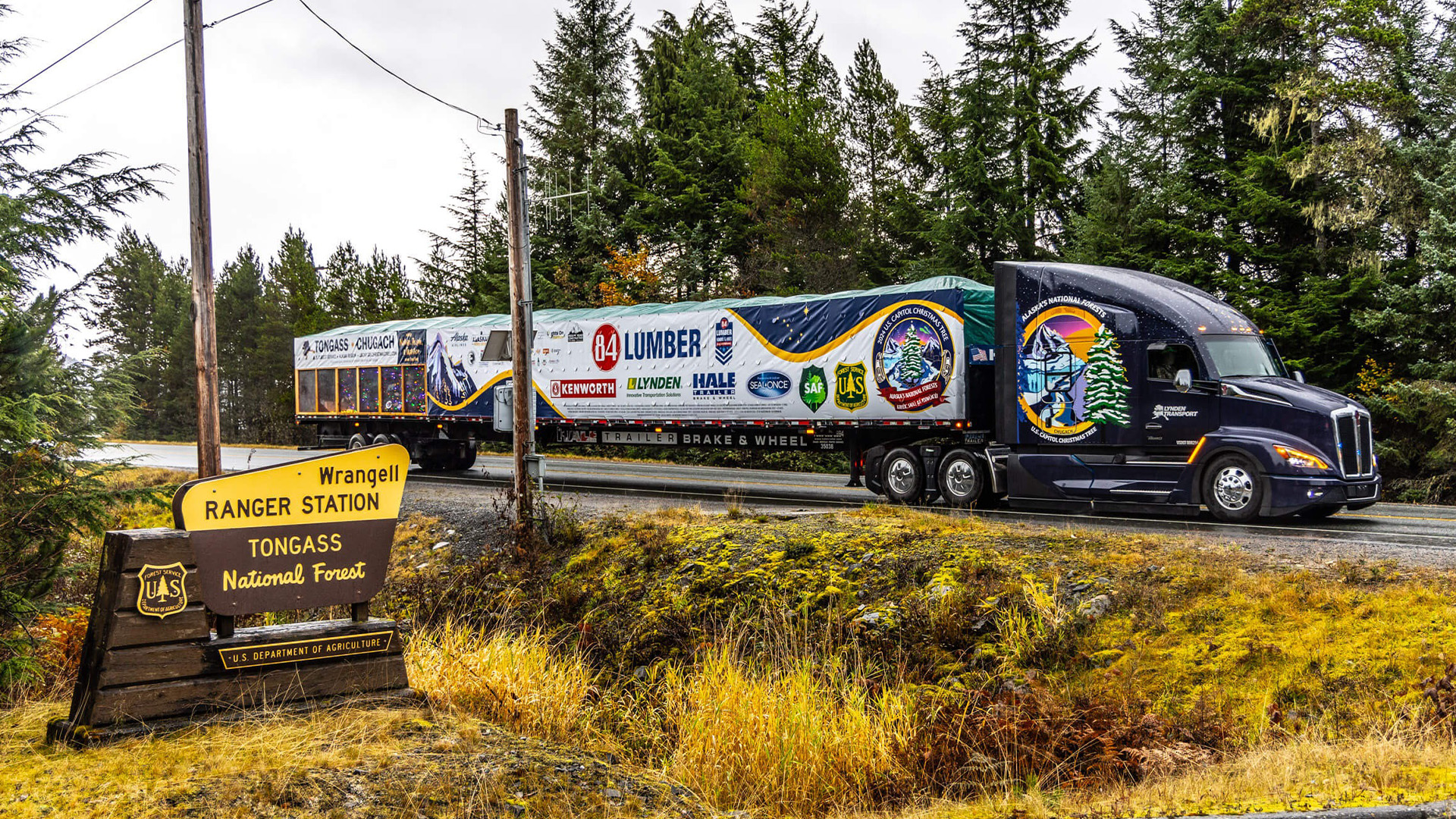 Nationally recognized driver John Schank and veteran transporter Fred Austin are the ones taking on the big job for Lynden Transport. This specific 74-foot Sitka Spruce was harvested from Alaska’s Tongass National Forest, and the harvest celebration just wrapped up in the town of Ketchikan. Lynden’s sister company Alaska Marine Lines then shipped it via barge to Seattle where the tree and trailer hitched up to the duo’s Kenworth T680. It’s now on the way to the U.S. Capitol Building’s West Lawn with a list of scheduled stops along the way.