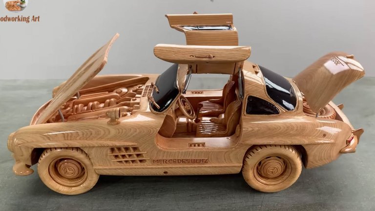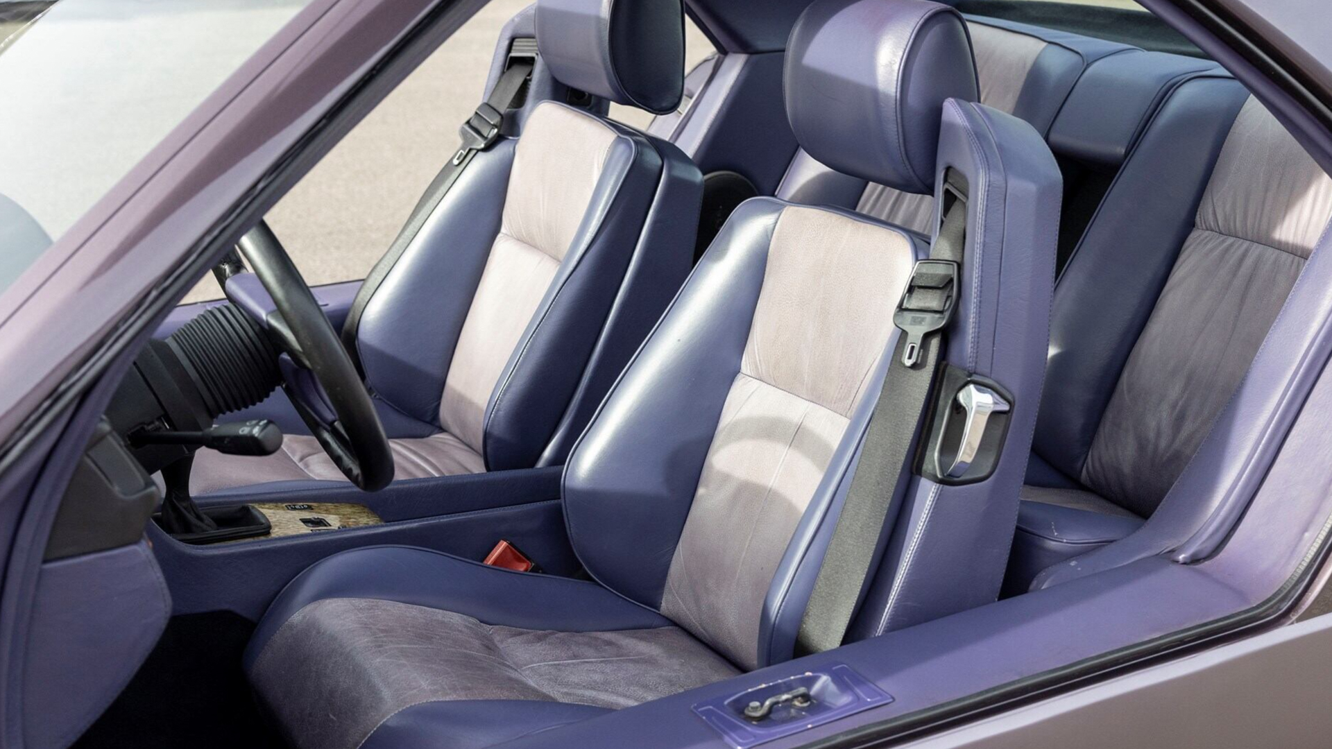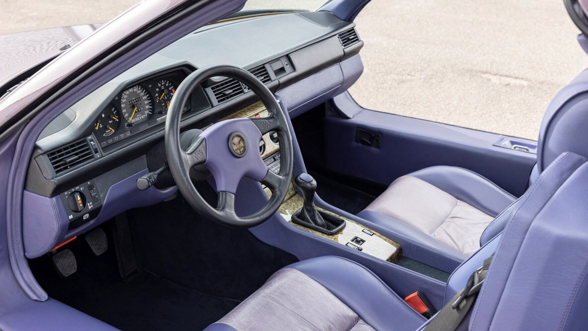 The car started out life as a W124-generation Mercedes 300CE, one of the very best looking coupes to ever wear the Silver Arrow. Then, German engineer Hartmut Boschert chopped it up. He cut into the car’s roof structure and chassis, shortening its wheelbase by almost 10 inches, and fit it with gullwing doors. Boschert then grafted on the face of an R129-gen Mercedes SL-Class and gave it his own emblem, which happens to resemble an upside down Mercedes logo. The result is a car that looks almost like a German Autozam AZ-1. Inside, the B300 Gullwing gets a R129 front seats, with a reupholstered purple interior.