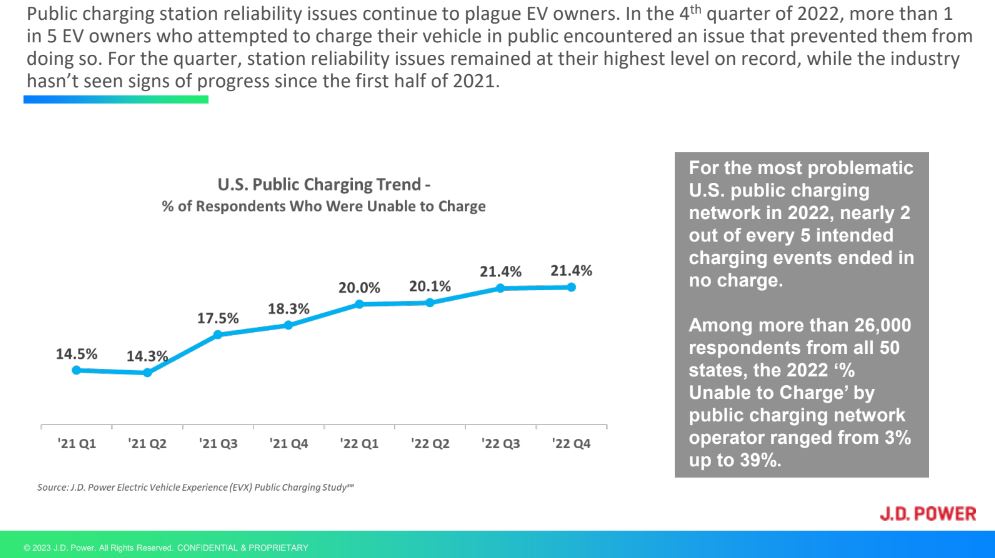 JD Power’s study examined more than 26,500 charging attempts in all 50 states across the U.S. Its latest update determined that the reliability of the charging network has remained fairly static between Q3 to Q4. However, that isn’t really a good thing considering that nearly one in five charging sessions, or 21.4% of all charges, resulted in some sort of problem. For reference, that number is up from 14.3% in Q2 2021.