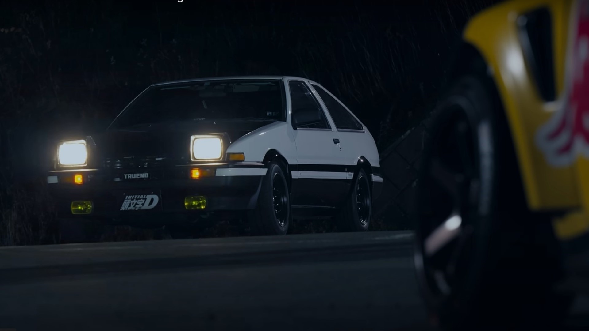 Before the burnout air clears, a mysterious Toyota AE86 appears. Well, that looks familiar. Who’s driving? Takumi Fujiwara in full animated form. Now the real race begins as both speed back down the tollway with Fujiwara leading, only headlights illuminating those blind corners.