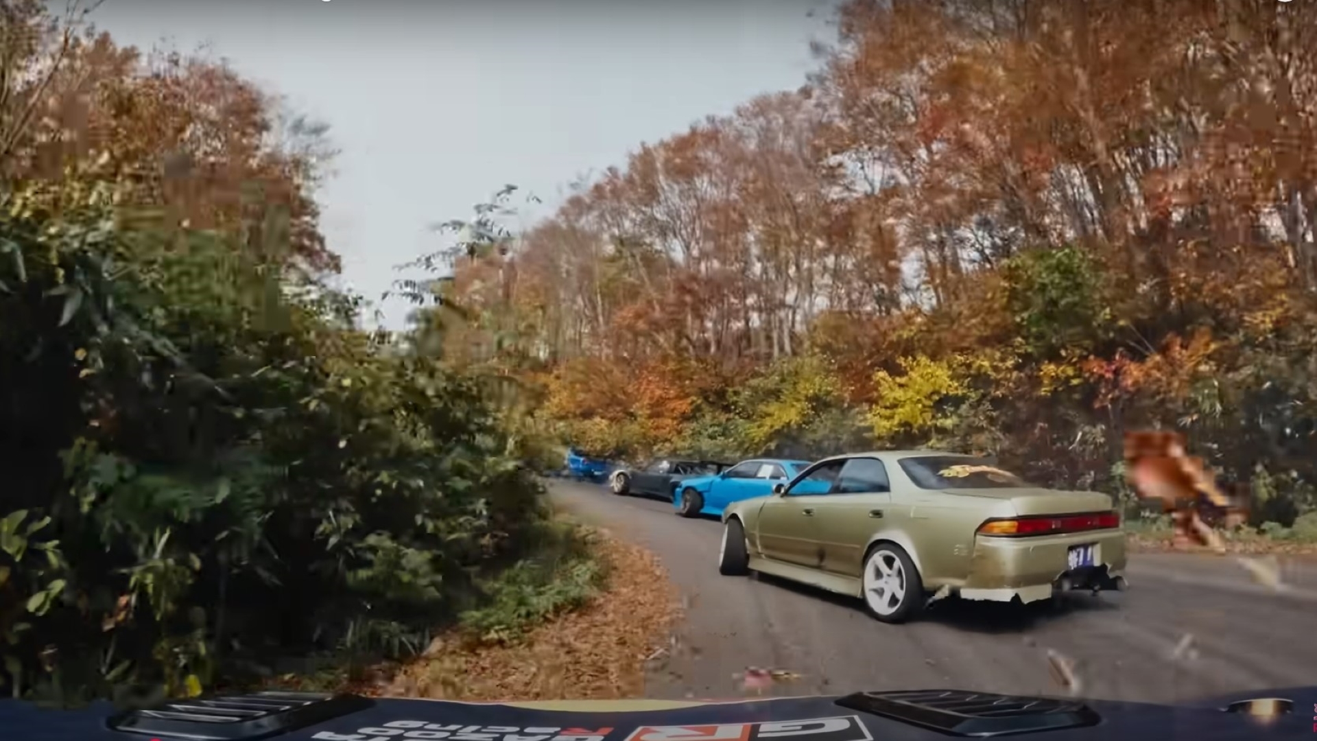First of all, they’re not basic JDM cars. They include a Nissan Skyline and 180SX, plus a Toyota Chaser and Mark II—all clearly modified. And the road, at least at this elevation, looks barely wide enough for two cars side-by-side. The odds are against him!
