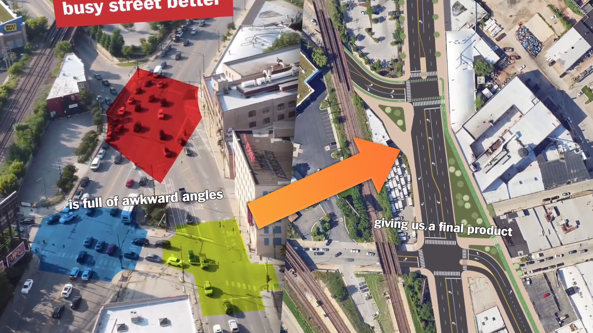 The solution? Completely cut out one of the legs of the triangle, slightly reshape the roads, and fill in the unused space for a simpler, safer, more navigable pair of intersections. It doesn’t neglect the safety of bicycle or foot traffic either, which is critical if you’re going to get bad drivers out of their cars.