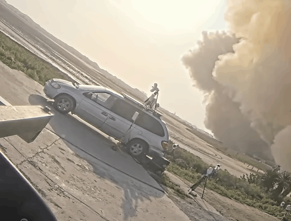 Several smaller pieces of debris make contact with the van during the launch. A few pieces even hit the expensive-looking gear mounted to the top of the van and nearby cameras set up to film the launch.