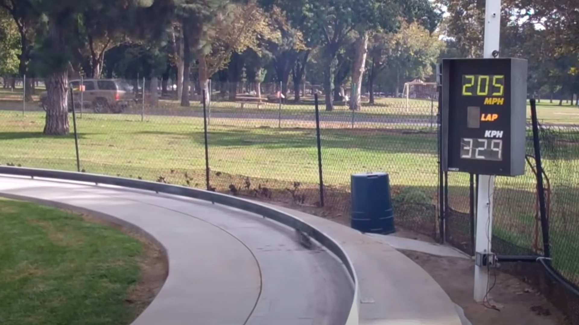 Of course, in the time trial above, the car hits an absolutely absurd 205 mph, which makes the simple-sounding hobby take on another level of complexity. That’s not a scale speed, that is a bonafide 205-mph toy being held onto by a guy with a steel rope, followed by him jumping onto a small platform to get out of the way when it’s moving too fast to hold onto. This, somehow, isn’t even the fastest one out there; the current official record-holder, according to the American Miniature Racing Car Association, clocks in at a blistering 215.9 mph on the standard-size 70-foot-diameter cement circle track. These speeds are achieved thanks to highly aerodynamic designs that resemble full-size top-speed-run Bonneville race cars, combined with miniature gearboxes paired with extremely efficient 10cc engines that run on methyl alcohol fuel. Those engines can rev up to 30,000 rpm, which, combined with a 200+ mph Doppler effect, leads to the insane sound heard in videos of top-speed runs.