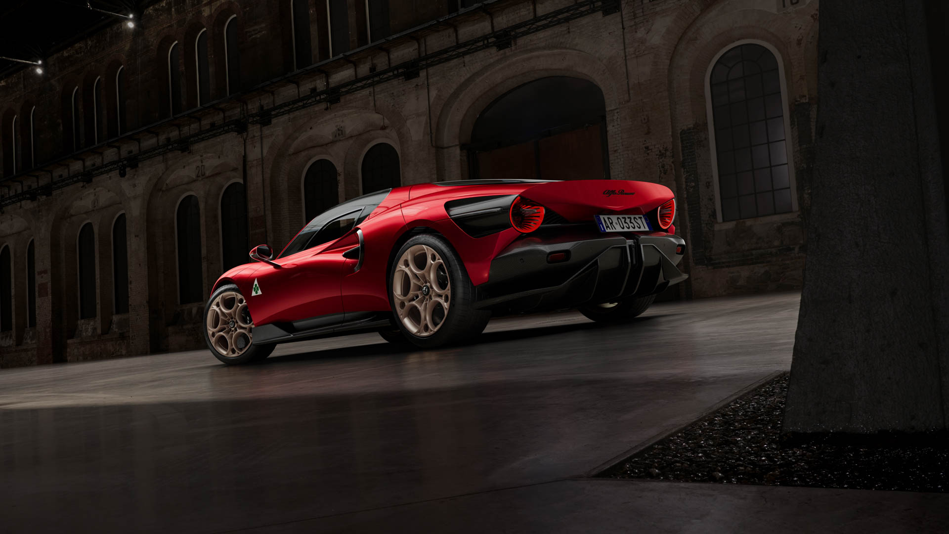 The gas-powered 33 Stradale sends its power through an eight-speed dual-clutch gearbox to the rear wheels, via a limited-slip diff. Alfa didn’t specify, but the electric version likely uses the same tri-motor setup as the Maserati GranTurismo Folgore, giving it two motors at the rear axle and a single motor up front. The electric 33 Stradale is said to have a WLTP-rated range of about 450 miles.
