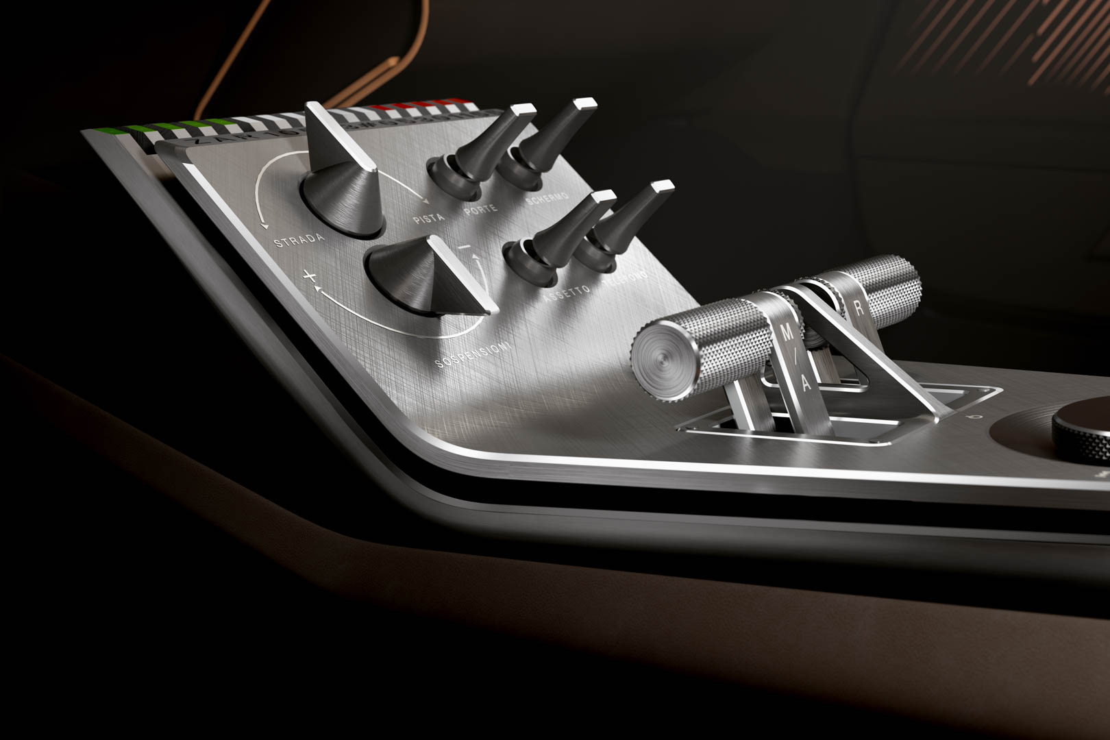 One of the coolest aspects of the cabin is its metal control panel. There are two knurled metal levers for gear selection: one for automatic or manual shifts and the other for reverse. There are also lovely metal switches for various other car controls, including suspension and drive modes. Adding even more visual drama are the ceiling mounted controls, which sit between the top edges of the door glass.