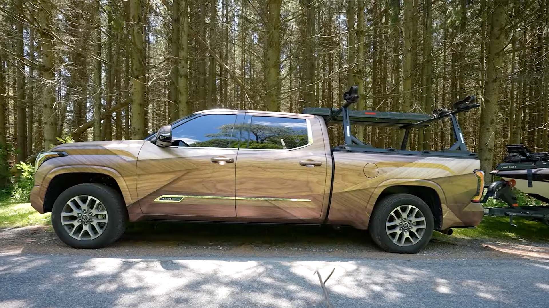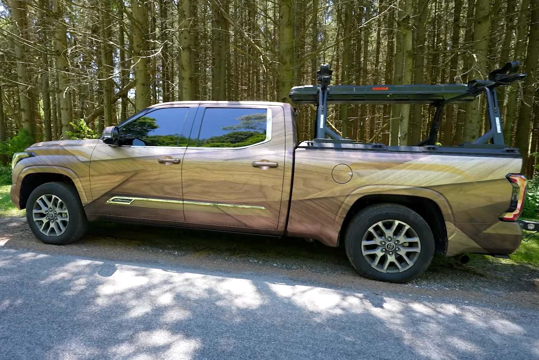 You can really see just how angular the 2022 Tundra is when it’s covered in a wrap like this. There are creases everywhere, front to back, and they’re highlighted with the contrasting colors in the woodgrain. For example, the grille surround is darker than what’s on the hood and front fenders. This also gives it a dynamic look, helping it resemble real wood.
