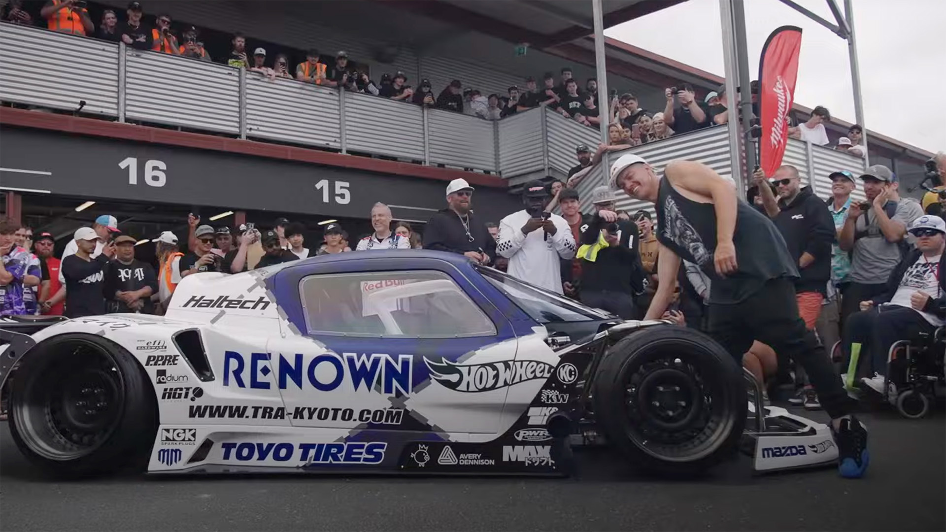 The full-sized 787D was unveiled at Mad Mike’s Summer Bash held at Hampton Downs in Waikato, New Zealand. Mad Mike is a Kiwi, if that wasn’t clear by now. The front-engined tube frame car is powered by what is claimed to be the world’s first five-rotor engine. The chassis was built in Japan by Tra Kyoto, the company behind Pandem and Rocket Bunny. The engine was designed and built by Pulse Performance Race Engineering in Whanganui, New Zealand. And if your inner monologue hasn’t switched over to Rhys Darby’s voice by now, I’m afraid we can’t be friends.