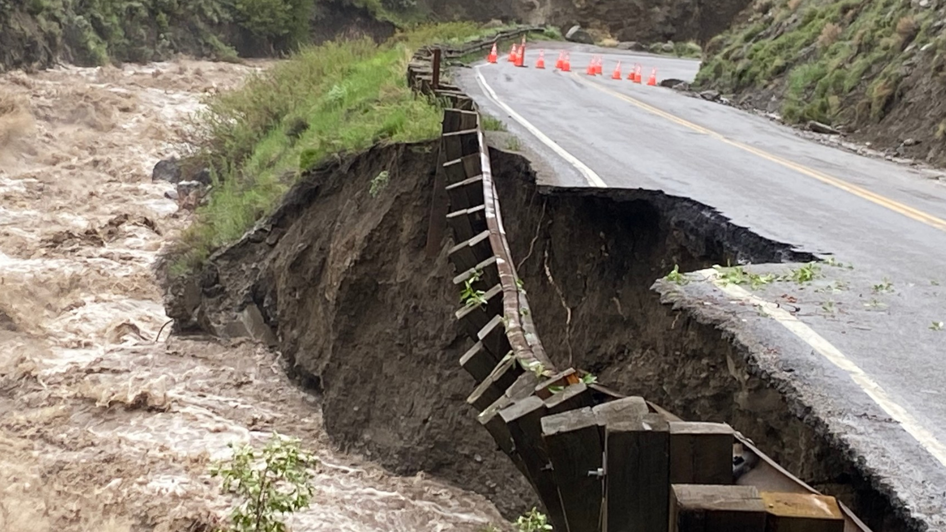 Meanwhile, several sections of the North Entrance Road have been entirely washed away by mudslides and flooding. Aerial footage captured by Yellowstone’s helicopter manager shows the roadway has entirely collapsed in several areas as a torrent of flood waters rages down the Gardner River. The section of road between Gardiner, Montana and the Mammoth Hot Springs looks to be virtually impassable by car.