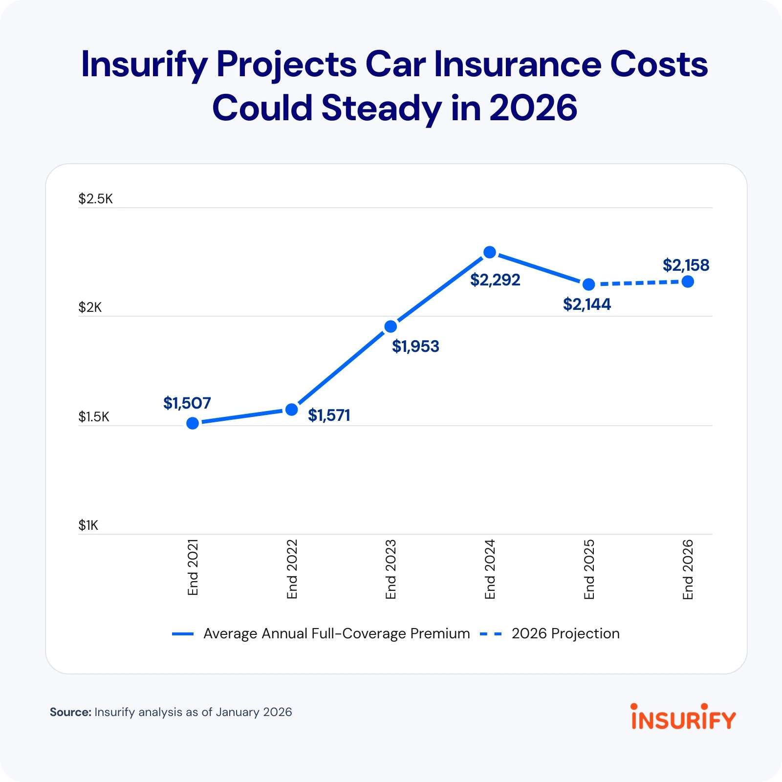 Rate changes tended to follow existing cost trends, with insurance tending to get more expensive in states that already had higher rates and less expensive in states with lower baseline rates. Insurify expects that to continue in 2026, widening the gap between the states where insurance is the most and least expensive. That will effectively freeze national average rates, with just a 1% increase to $2,158 for an annual full-coverage premium expected.