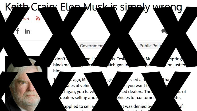 I don’t know anyone in Michigan who objects to Tesla opening stores there, except franchised dealers. The enemy of the consumer isn’t Tesla, it’s Keith Crain and the double-talk his column represents.
