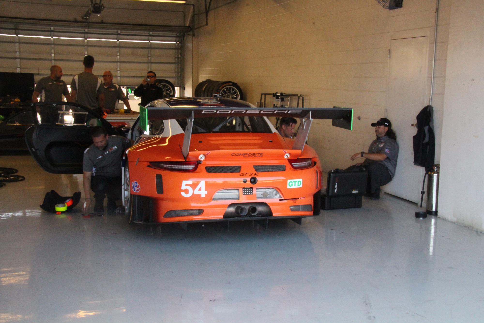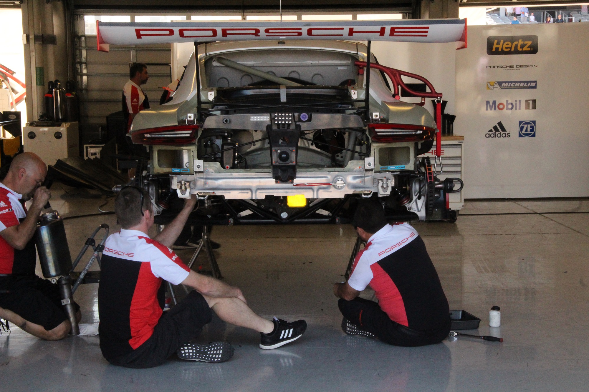 Another late night and another late start got me to the track just before lunch, and just before the Continental Tire race. I decided to spend some time walking through the paddock capturing Porsches in their natural habitat. The 911 RSRs were sitting in their respective garages with the rear bodywork removed, allowing me to see the rear suspension setup and the lack of engine in the back of the car. You can see a lot of really cool details in those cars. There were also a few GT3R examples hanging around in the garages preparing for Saturday’s IMSA race.