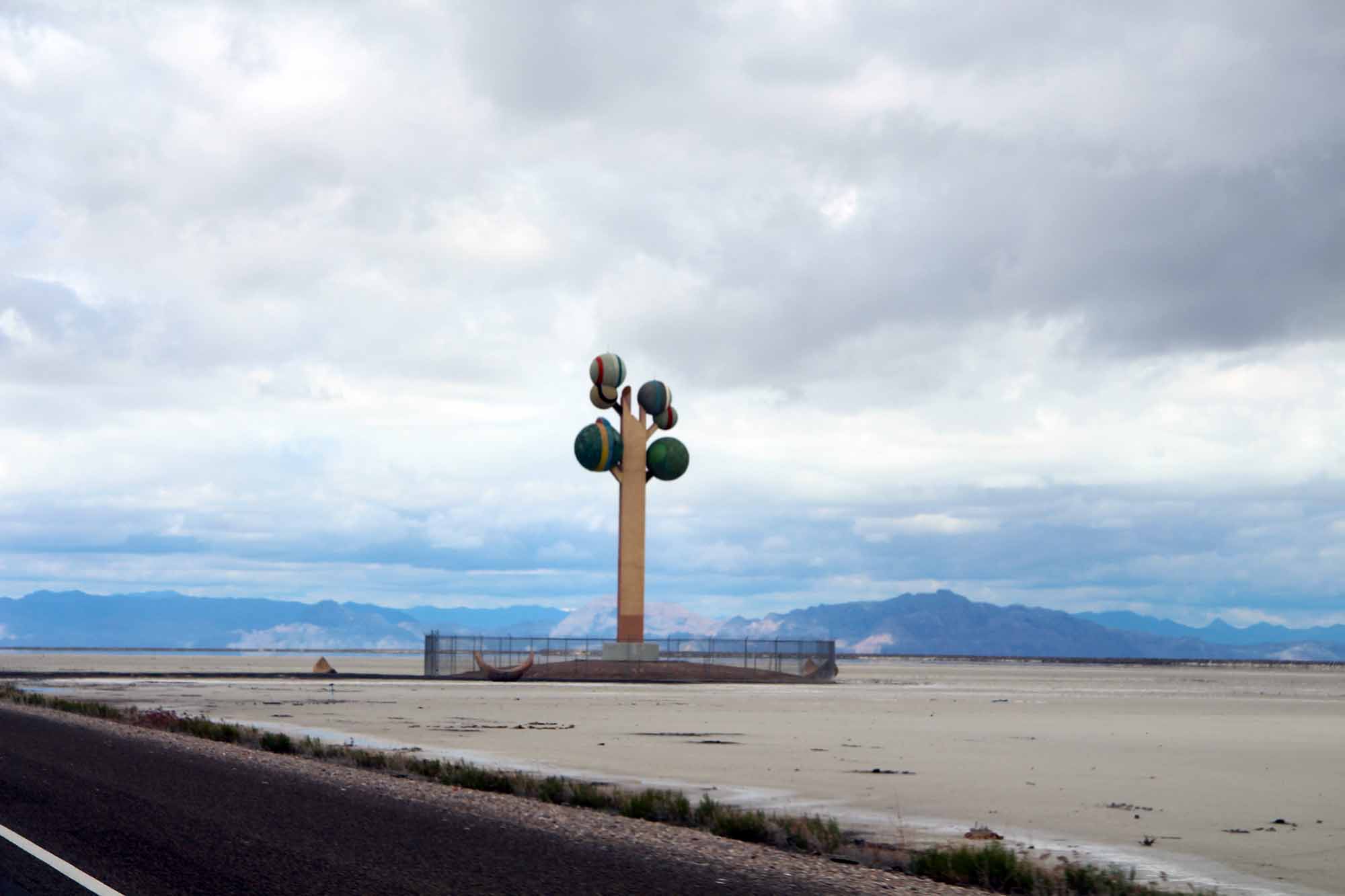 After my coffee was gone and I’d made the rounds to talk to everyone, I said some goodbyes and got back on the road. 8 hours of driving left to do, it’s better to get it over with. About an hour into the trip, I saw this weird art installation in the middle of the Utah desert on the eastern edge of the salt flats. I had to stop and check out the “Tree of Utah.”