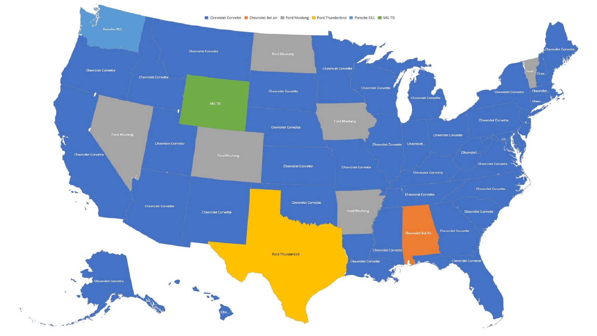 It is hardly a secret that Americans love their Corvettes, and Mustangs. Those muscle cars are highly sought after by lifelong collectors and devotees, plus they were made in significant number for decades. Ford sold two million Mustangs in the 1960s alone, while it took Porsche until just recently to sell that many 911s. So, when Hemmings decided to determine which states loved (and listed) which collector cars most, it’s hardly a surprise that most of the country is dominated by that muscle duo. In order to derive this interesting data set, Hemmings trawled through their classic car listings dating back to 2010 looking for the most common listing in each state.