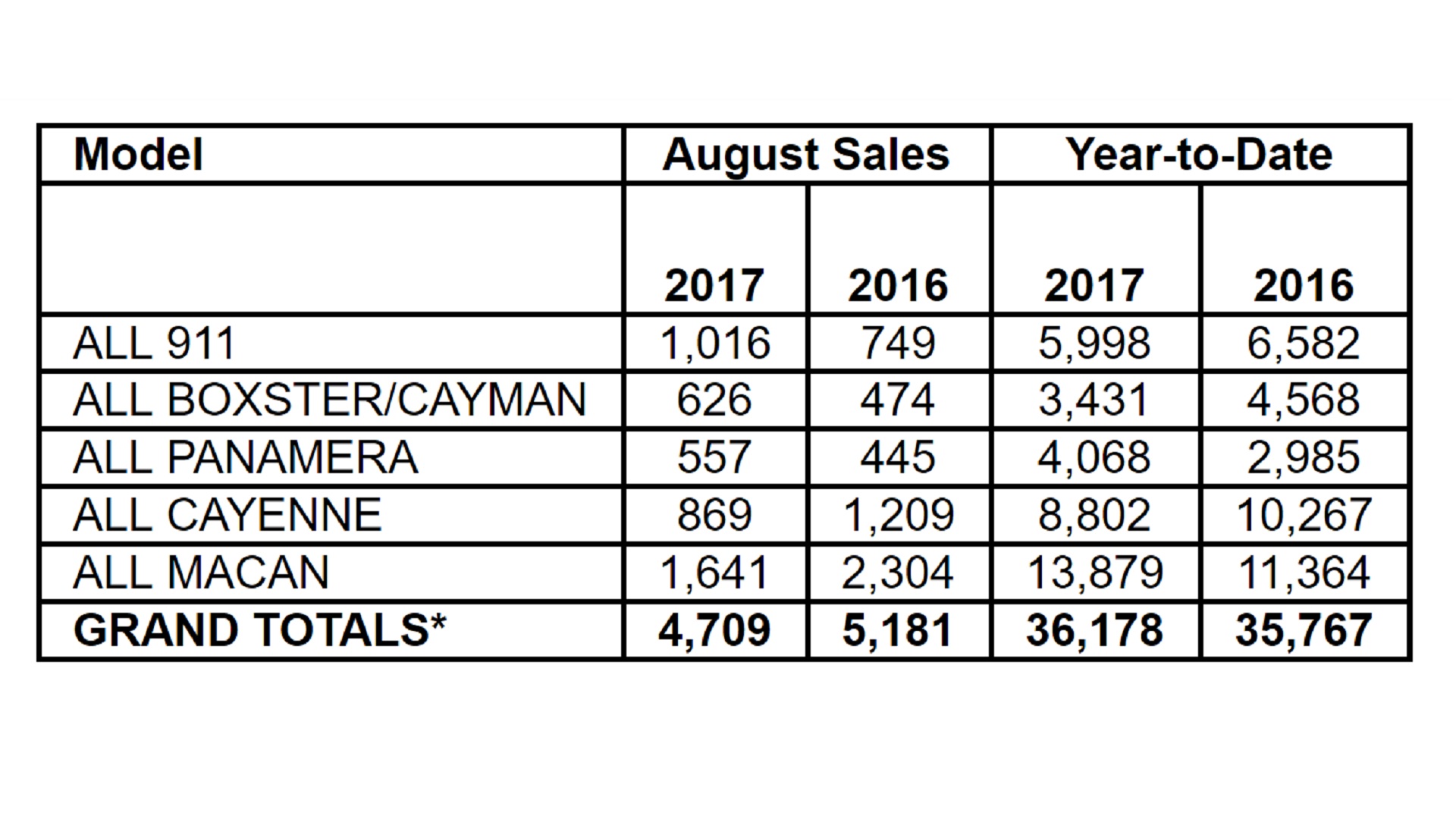 Meanwhile, in the Approved Certified Pre-Owned department, Porsche has been killing the market, moving 1,606 CPO units. This represents a 14.7 percent increase over August of last year, pumping year-to-date numbers up to 7.3 percent across the first eight months of 2017. There is no breakdown of which models sell in what quantities as pre-owned, but we’d wager the split is fairly similar to new car sales.