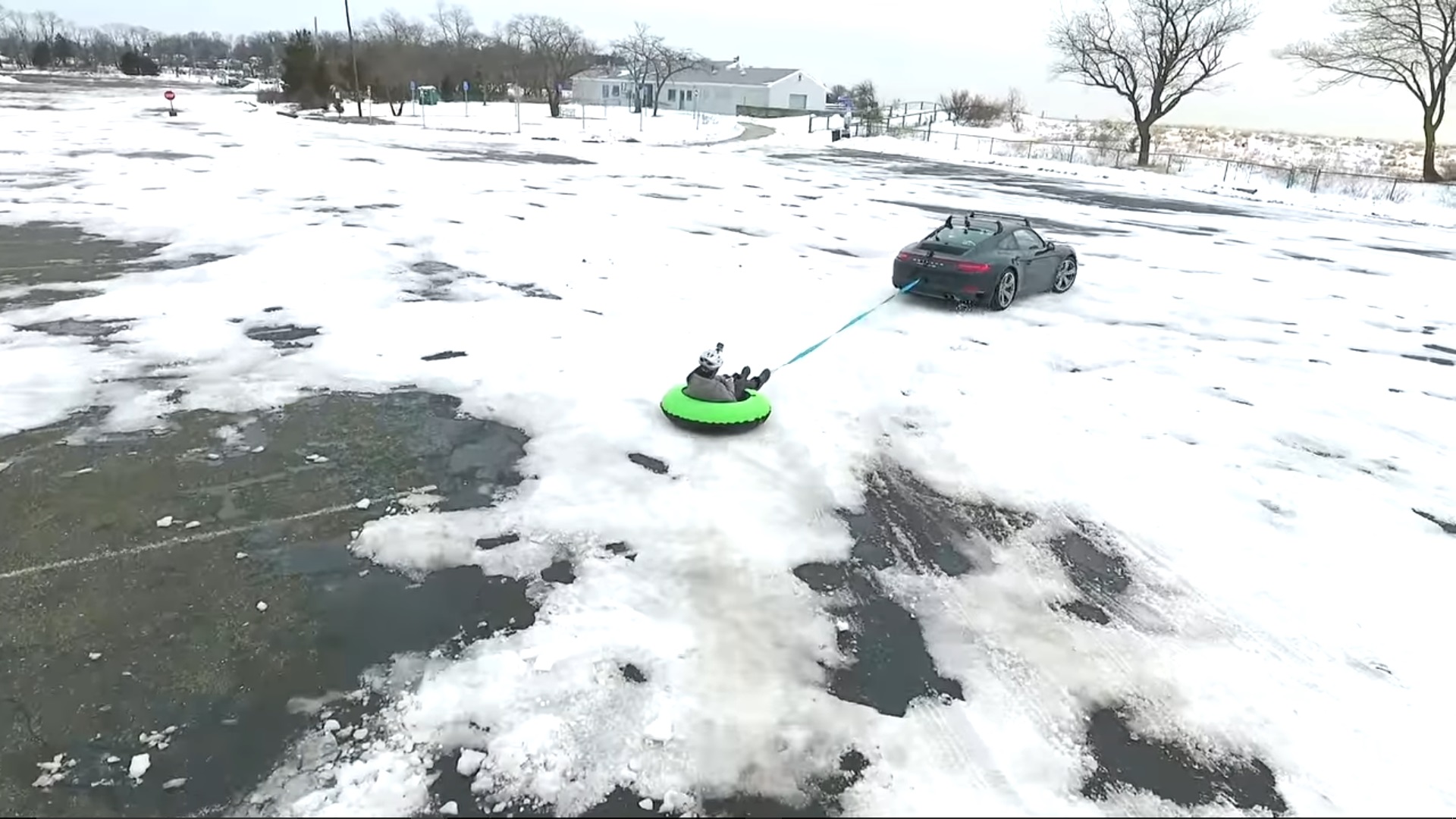 In watching this video we can only imagine a small German man at Porsche headquarters in Stuttgart being very upset over the result of this video. In our head he’s very stereotypically German, sitting in an austere modern office behind a desk made of glass in a perfectly tailored no-nonsense suit with a solid grey tie. In watching this video he slowly stands from his desk and says “This activity is not within the parameters for which we have designed this car. We at Porsche under no circumstances would endorse snow tubing behind the dynamic and comfortable All-New Turbocharged Porsche 911 Carrera 4S, combined fuel consumption 8.9-7.9 liters per 100 km, urban cycle 12.4-10.3 liters per 100 km, extra-urban cycle 6.8-6.6 liters per 100 km; CO2 emissions 204-180 grams per kilometer. This is not appropriate!”