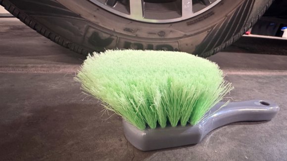 This wheel brush from Chemical Guys features flagged bristles for gentle cleaning. The feathering also helps the bristles to hold more soap. The bristles are chemical resistant and can remove grime and grease that has caked on wheels, rims, tires, and undercarriages.