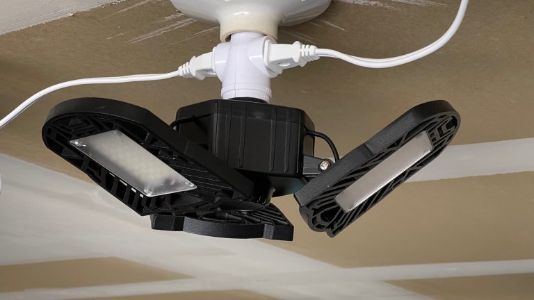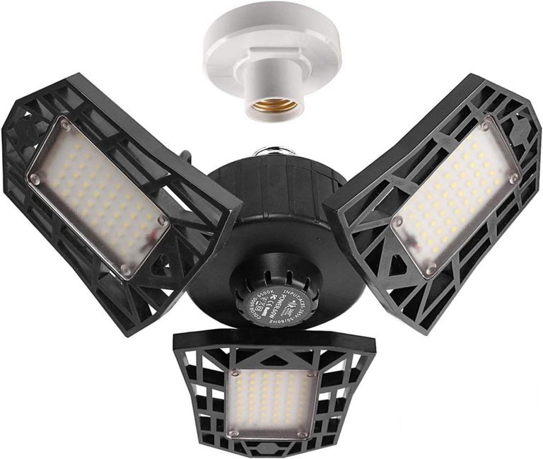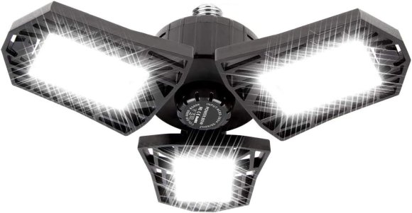 The Lightdot 2 Pack LED Garage Lights are 60 watts, have three adjustable LED panels, and are designed to give fluorescent fixture levels of light while using a standard light socket. They can be folded up to 90 degrees with a maximum coverage of 360 degrees. These lights are rated an output of 6000 lumens, might be generous.