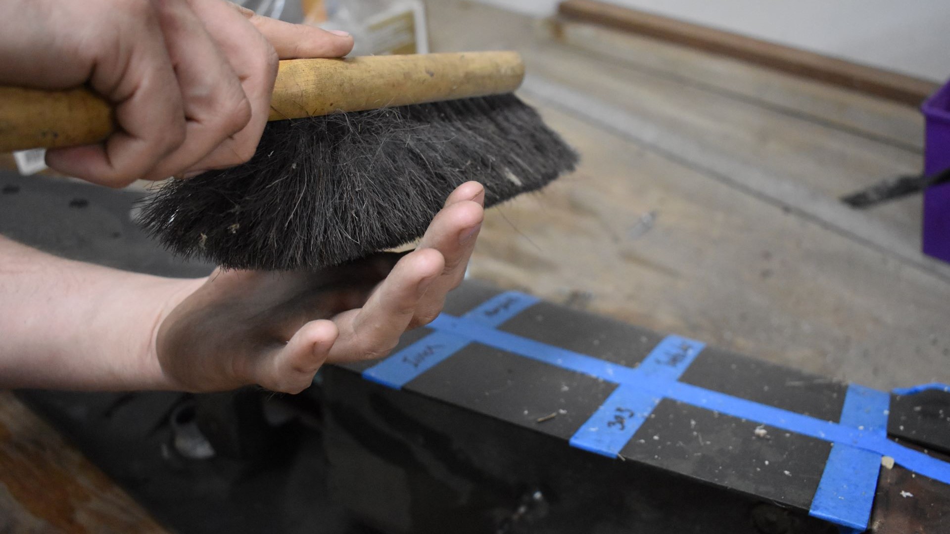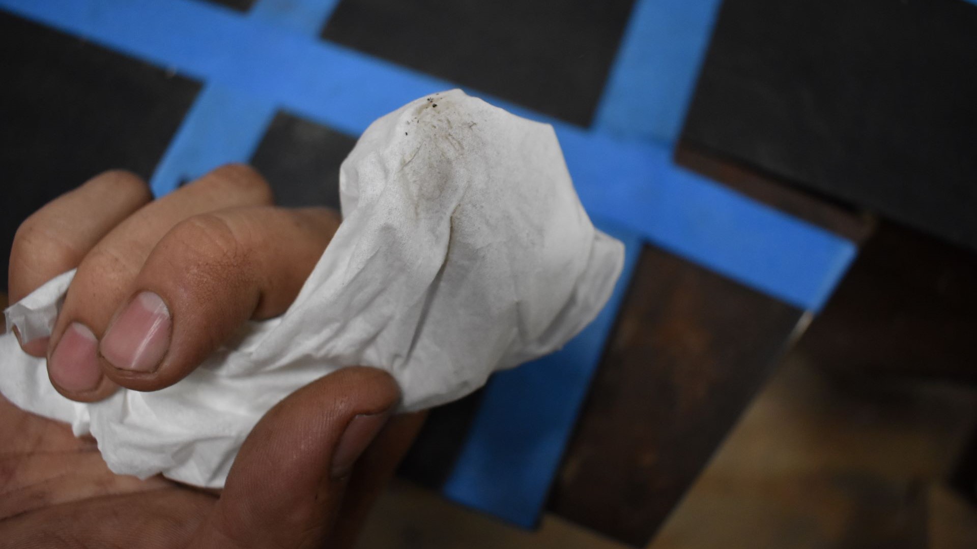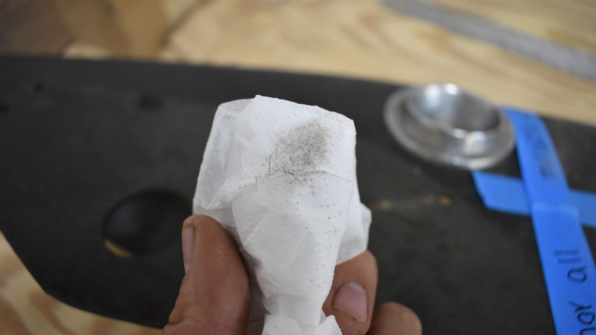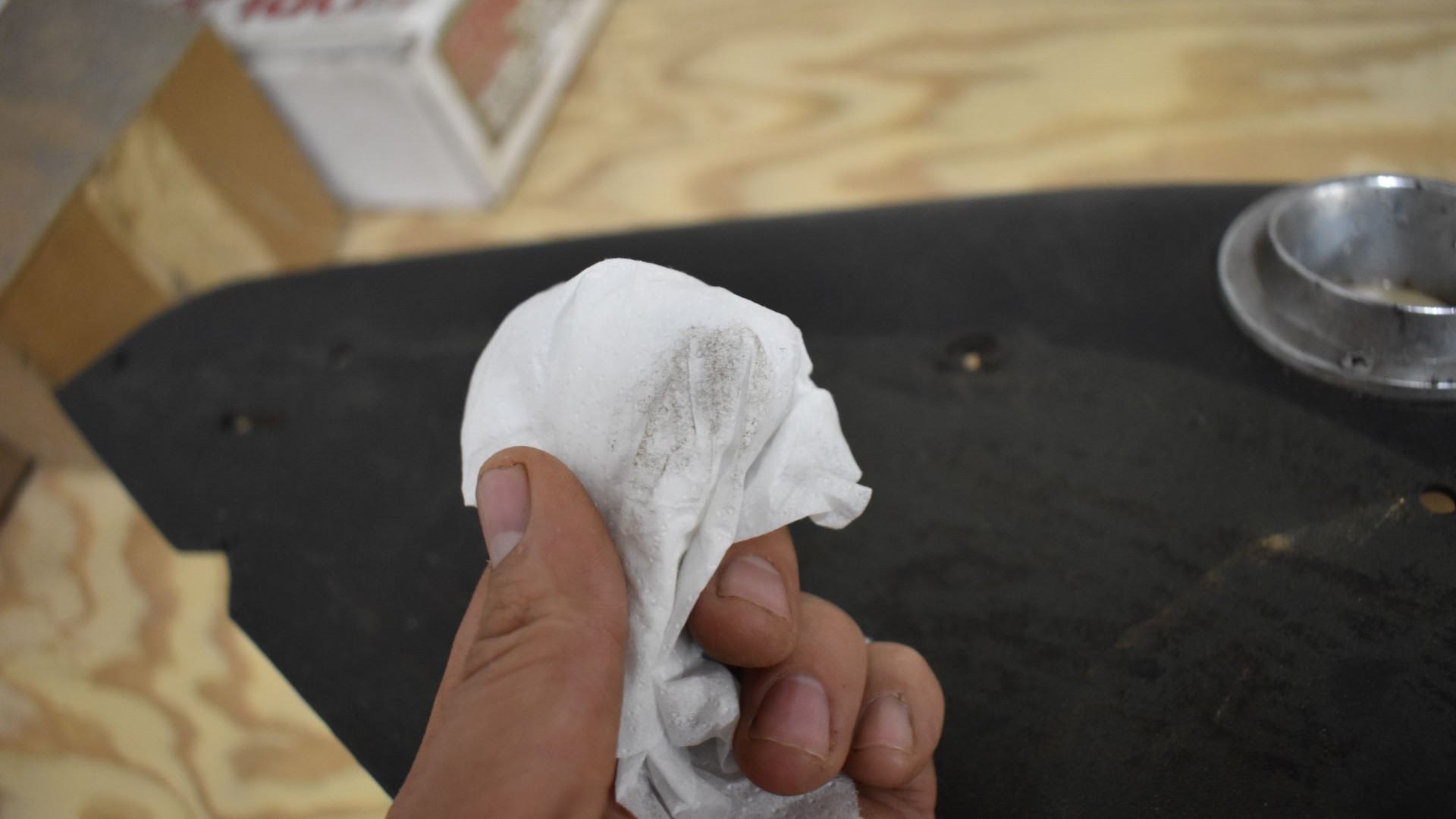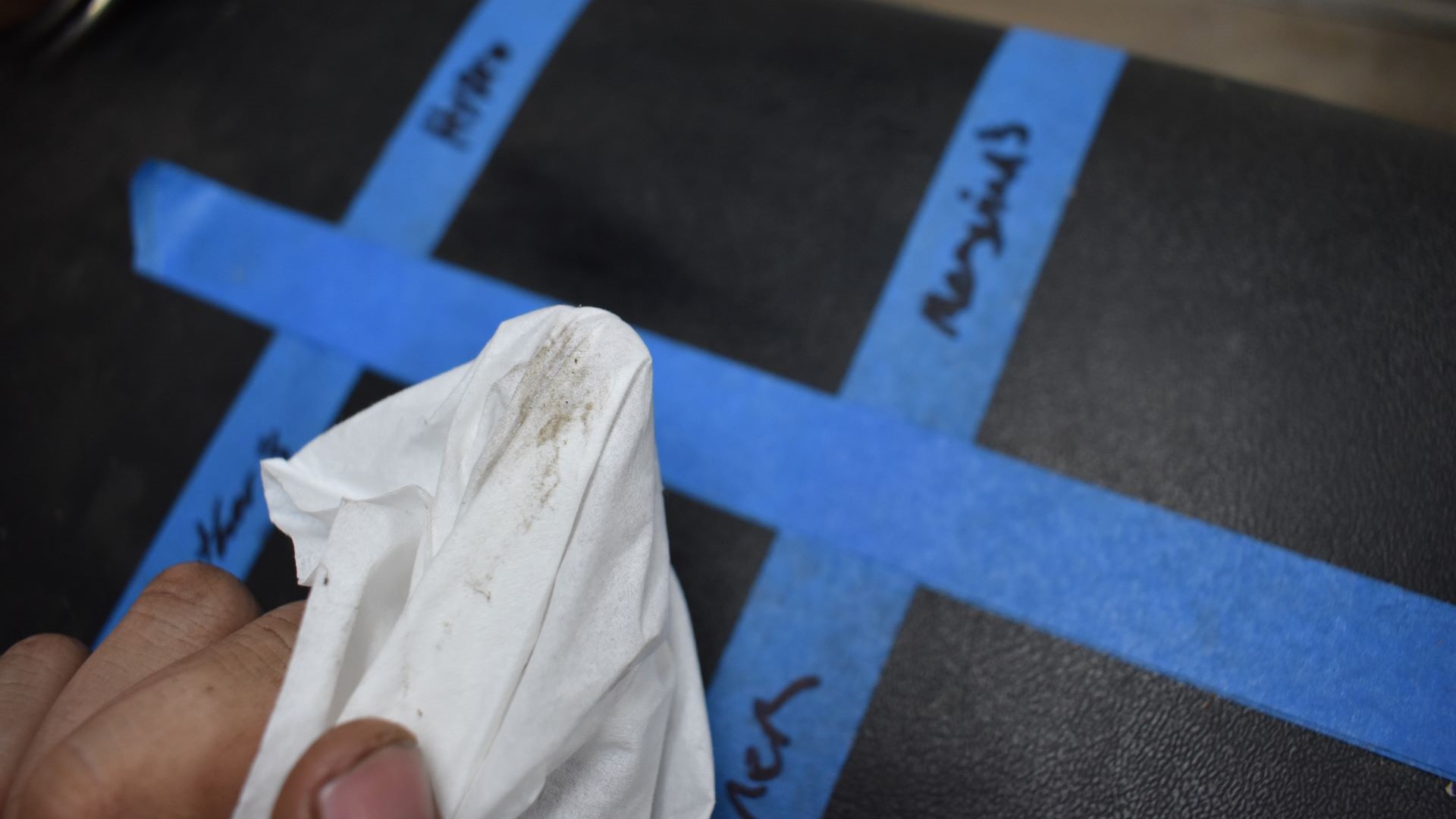 Since it’s difficult to accumulate dust in short order, I decided to shake off a shop broom above each section. Then I gave the console a good shake. A quick swipe of tissue would reveal how much dust remained on the surface after each cleaner was applied.