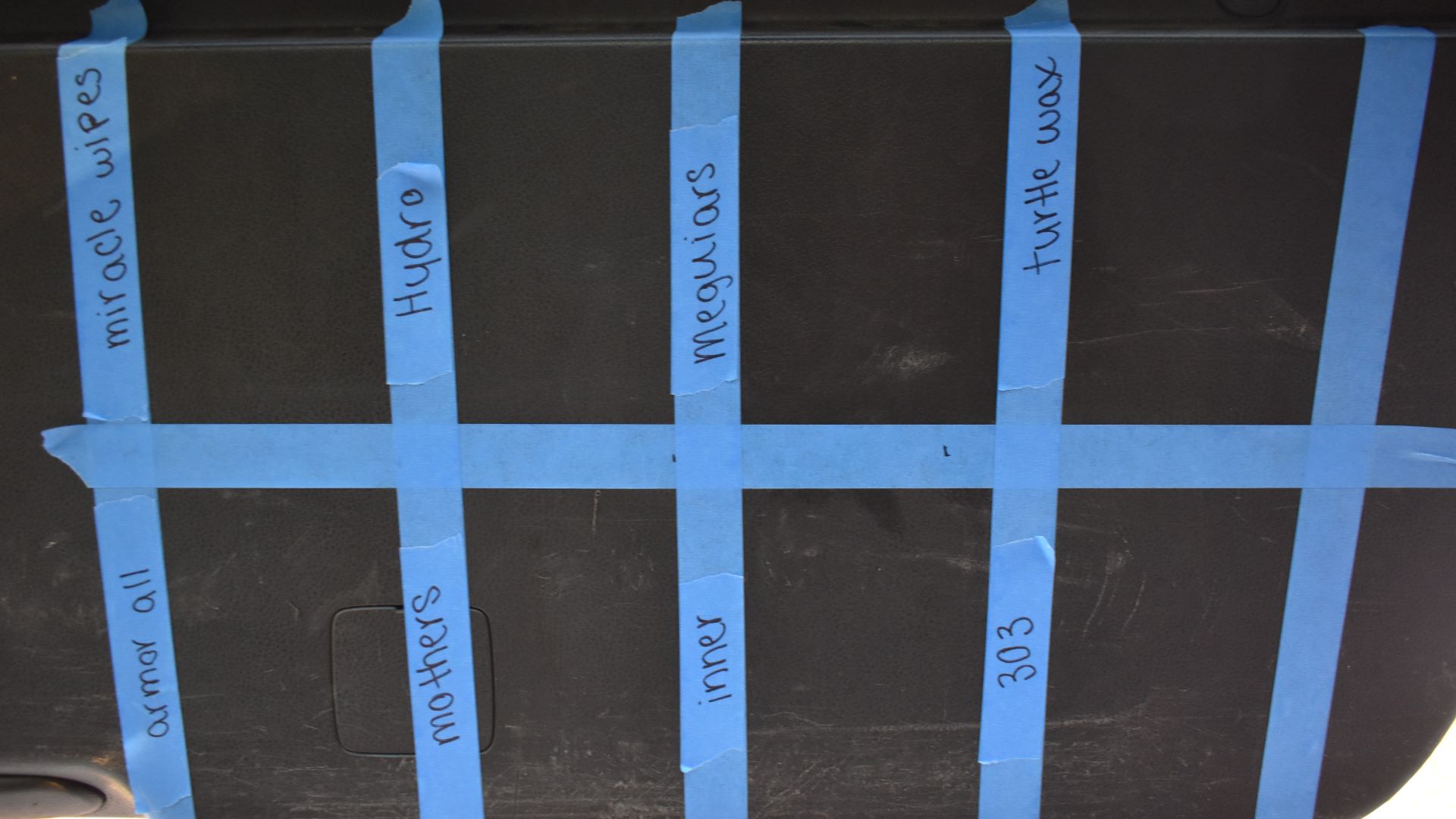 With eight products to test, dashboard space was tight. Instead, we opted to use the rear hatch of a Honda Crosstour. The surface test is pretty standard. I used a large area with a typical buildup layer, taped off a section for each of the cleaners, and compared the results side by side. This provided an overall look at how the products performed as a cleaning agent and a look at the finish each left behind.