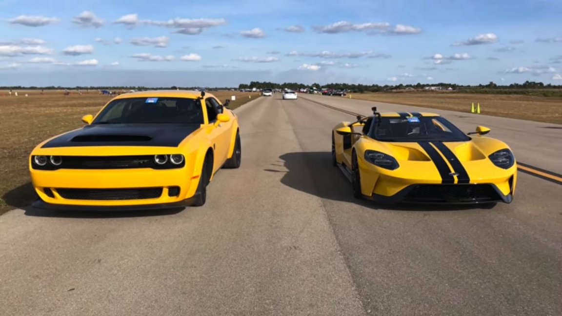 Watch a 2018 Ford GT Face Off Against the Dodge Challenger Demon in a Half-Mile Drag Race