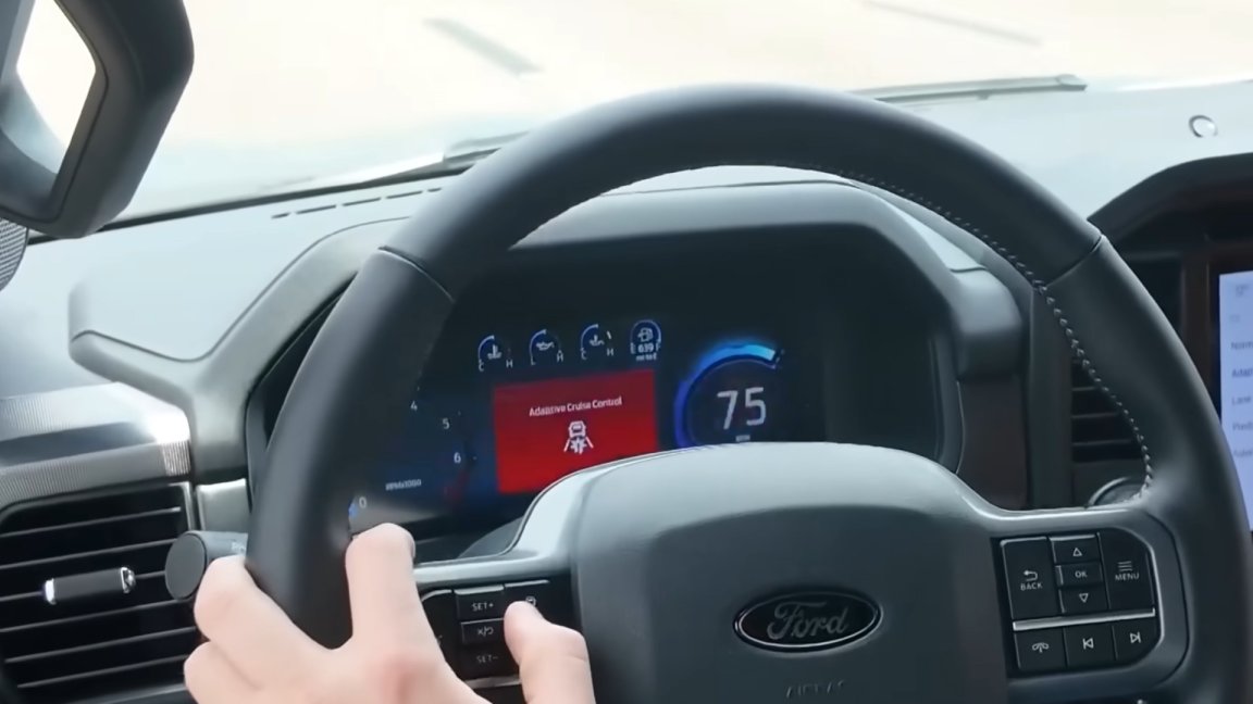 A 2024 Ford F-150's adaptive cruise control system displays a collision warning while activating its brakes unexpectedly.