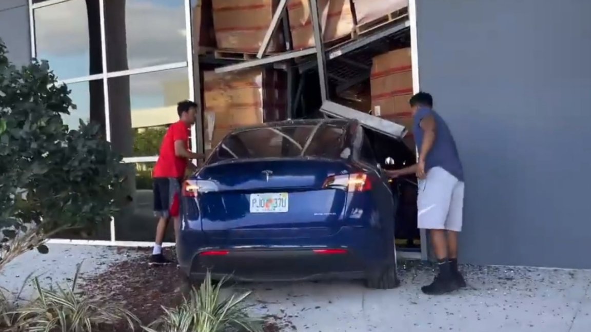 Watch Someone Crash a Tesla Into a Warehouse at High Speed