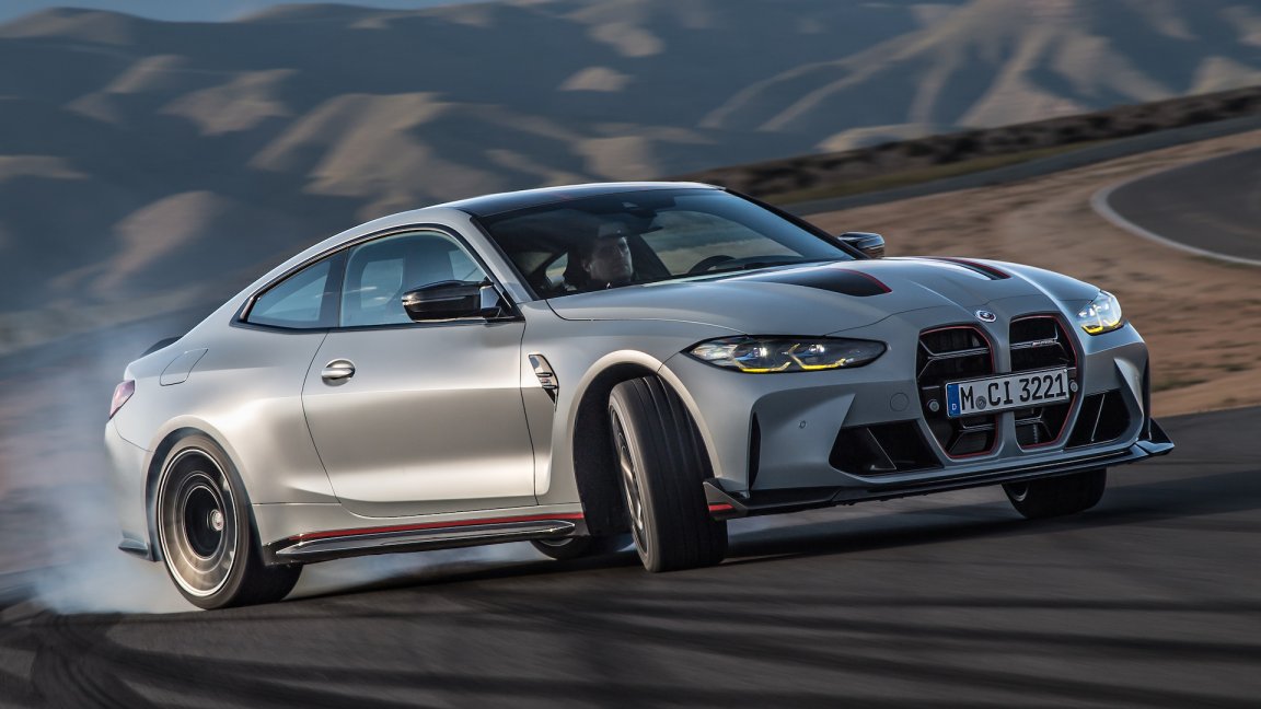 A gray 2023 BMW M4 CSL is powersliding on a racetrack.