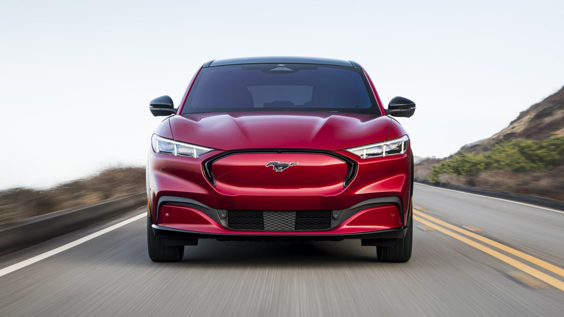 Front head-on image of a red Ford Mustang Mach-E at speed on a road.