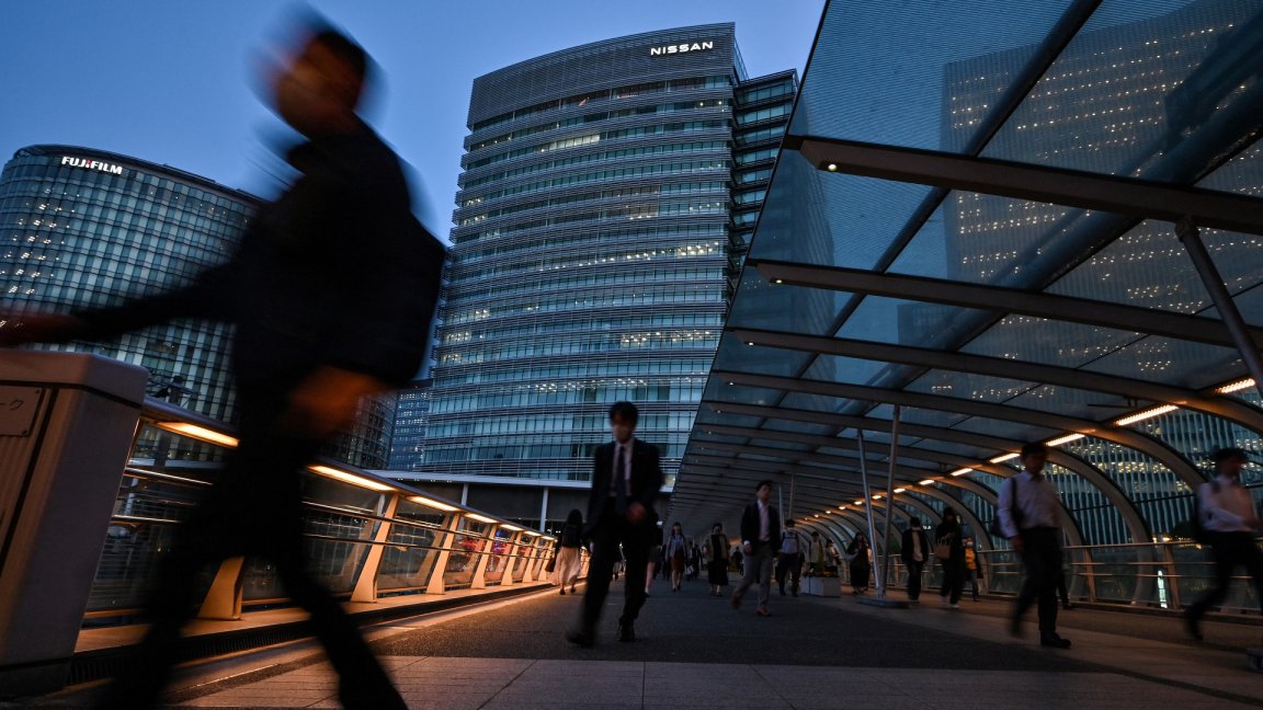 Pedestrians walk along an elevated passageway outside the headquarters building (back C) for Japanese automaker Nissan in the city of Yokohama, Kanagawa prefecture on May 13, 2025. Japanese automaker Nissan posted a huge annual net loss of 4.5 billion USD on May 13, while confirming reports that it planned to cut 20,000 jobs worldwide.