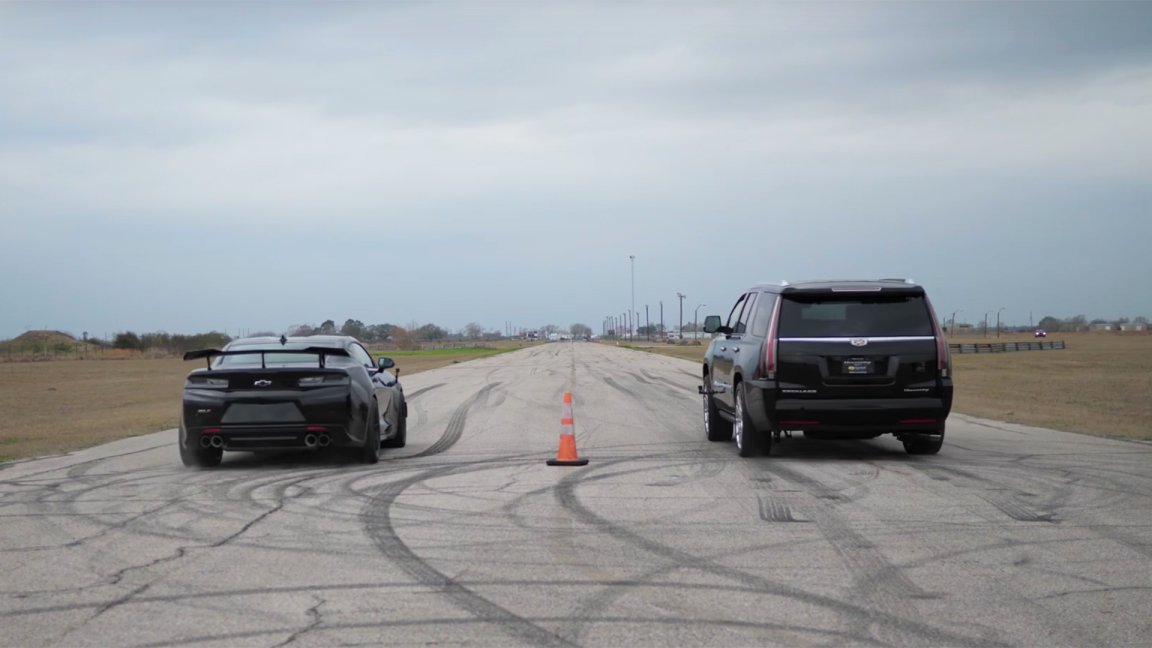 Watch This 805-HP Cadillac Escalade Smoke a Chevrolet Camaro ZL1 1LE