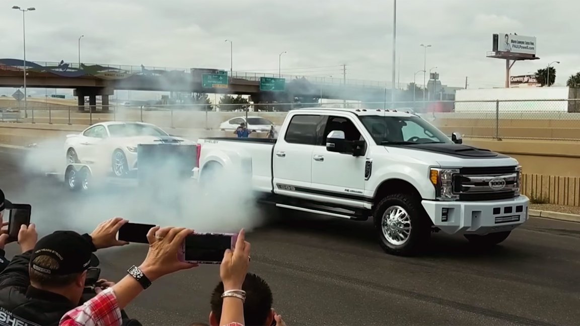 Shelby 1000 Diesel Dually Truck Double Burnout With a Super Snake Mustang Is Maximum America