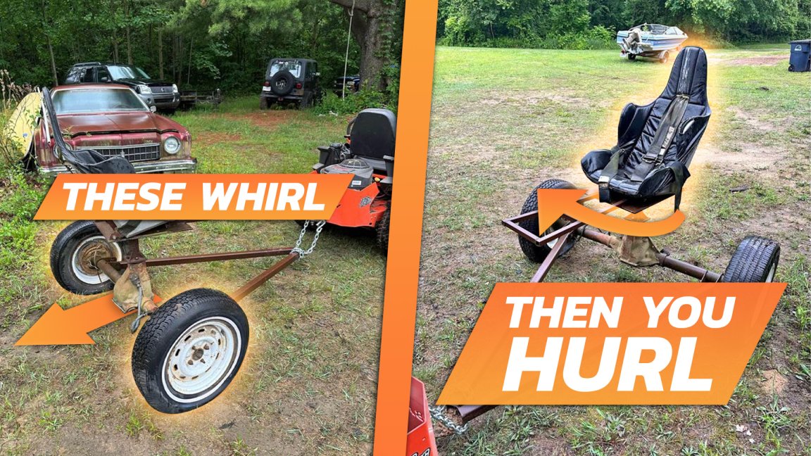 Side-by-side photos of a homemade car seat Hurl-a-Whirl on Facebook Marketplace with arrows added to explain how the axle spins the occupant, with the text superimposed "These Whirl" and "Then You Hurl."