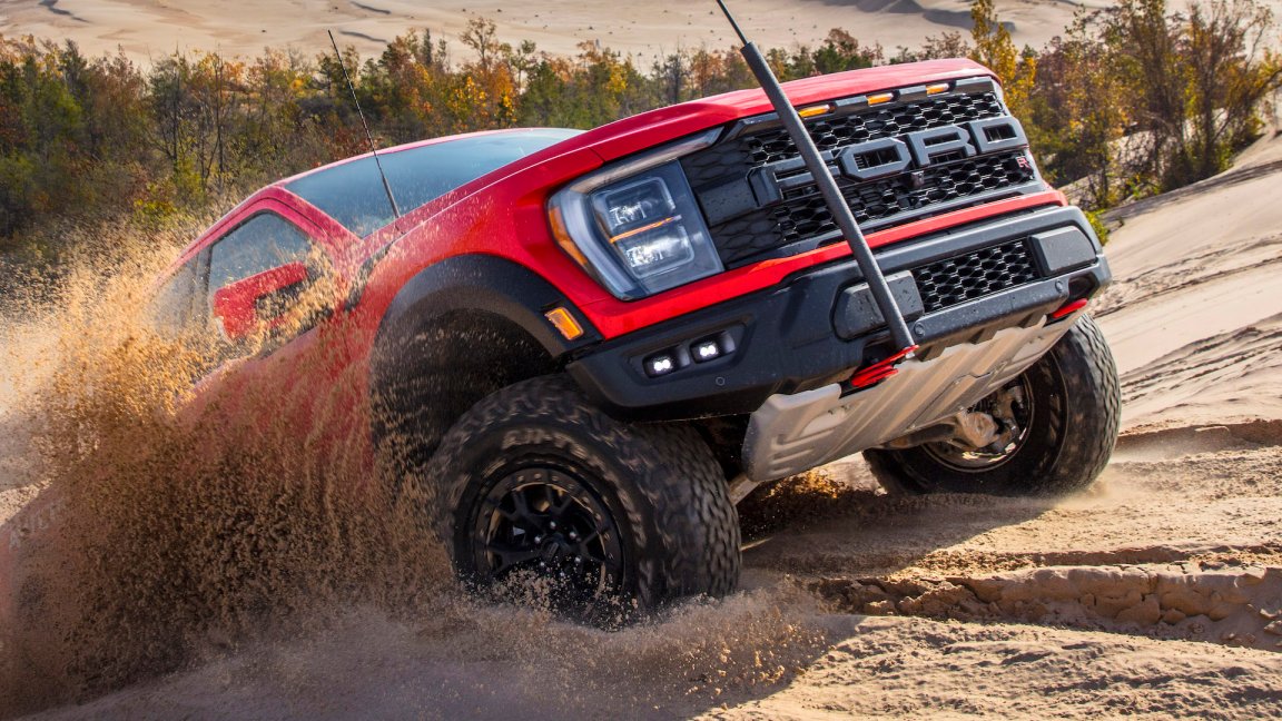 2023 Ford F-150 Raptor R scatters sand as it crests a hill