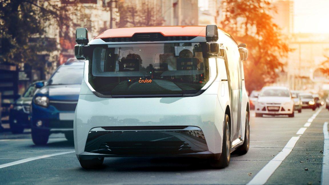 A General Motors Cruise AV against a backdrop of San Francisco, California