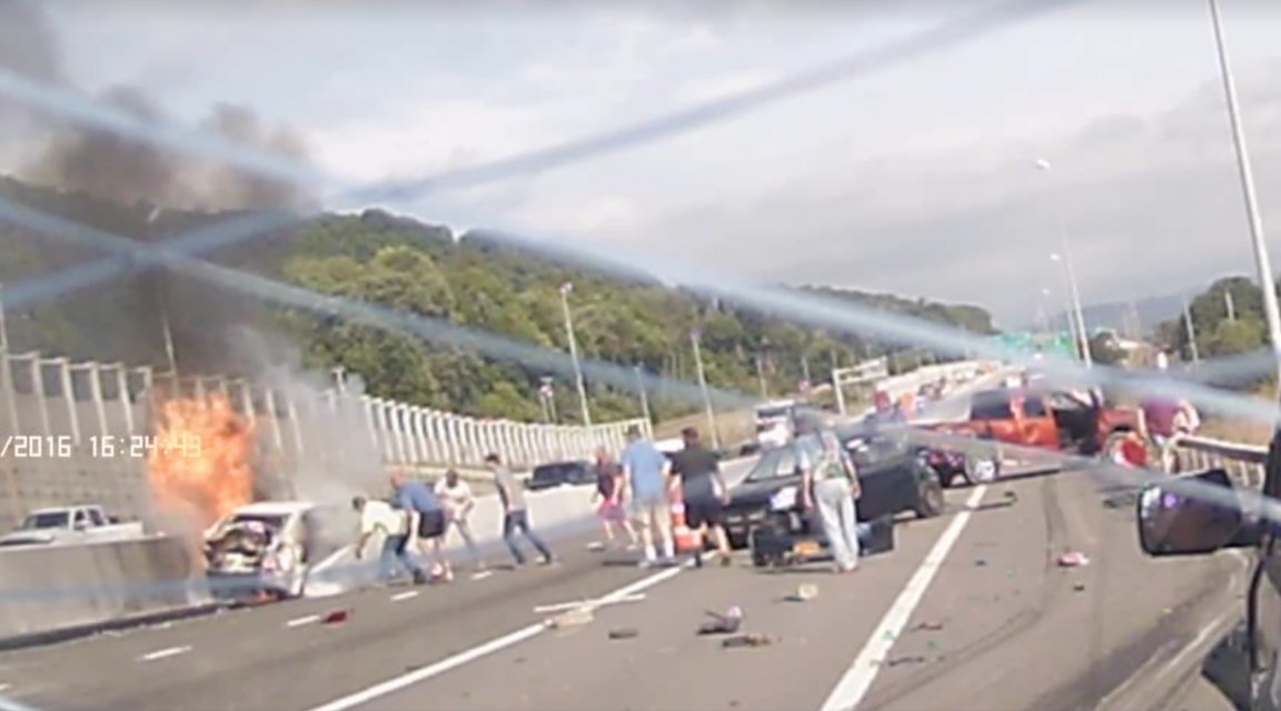Watch These Heroes Pull a Woman From a Burning Car After a Massive Crash